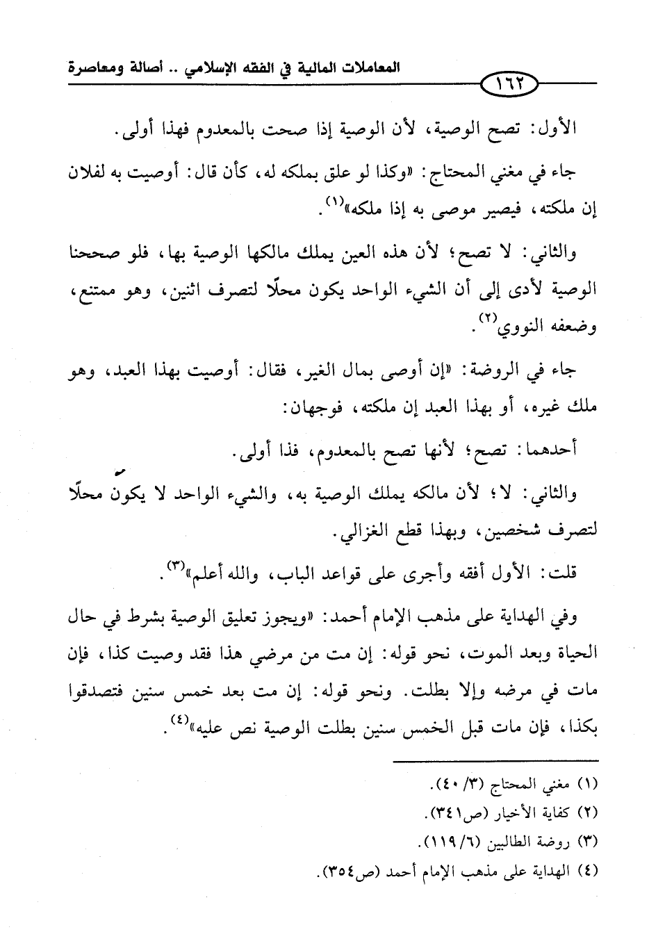 وفي الهداية على مذهب الإِمام أحمد: "ويجوز تعليق الوصية بشرط في حال الحياة وبعد الموت، نحو قوله: إن مت من مرضي هذا فقد وصيت كذا، فإن مات في مرضه وإلا بطلت. ونحو قوله: إن مت بعد خمس سنين فتصدقوا بكذا، فإن مات قبل الخمس سنين بطلت الوصية نص عليه" (¬٤).