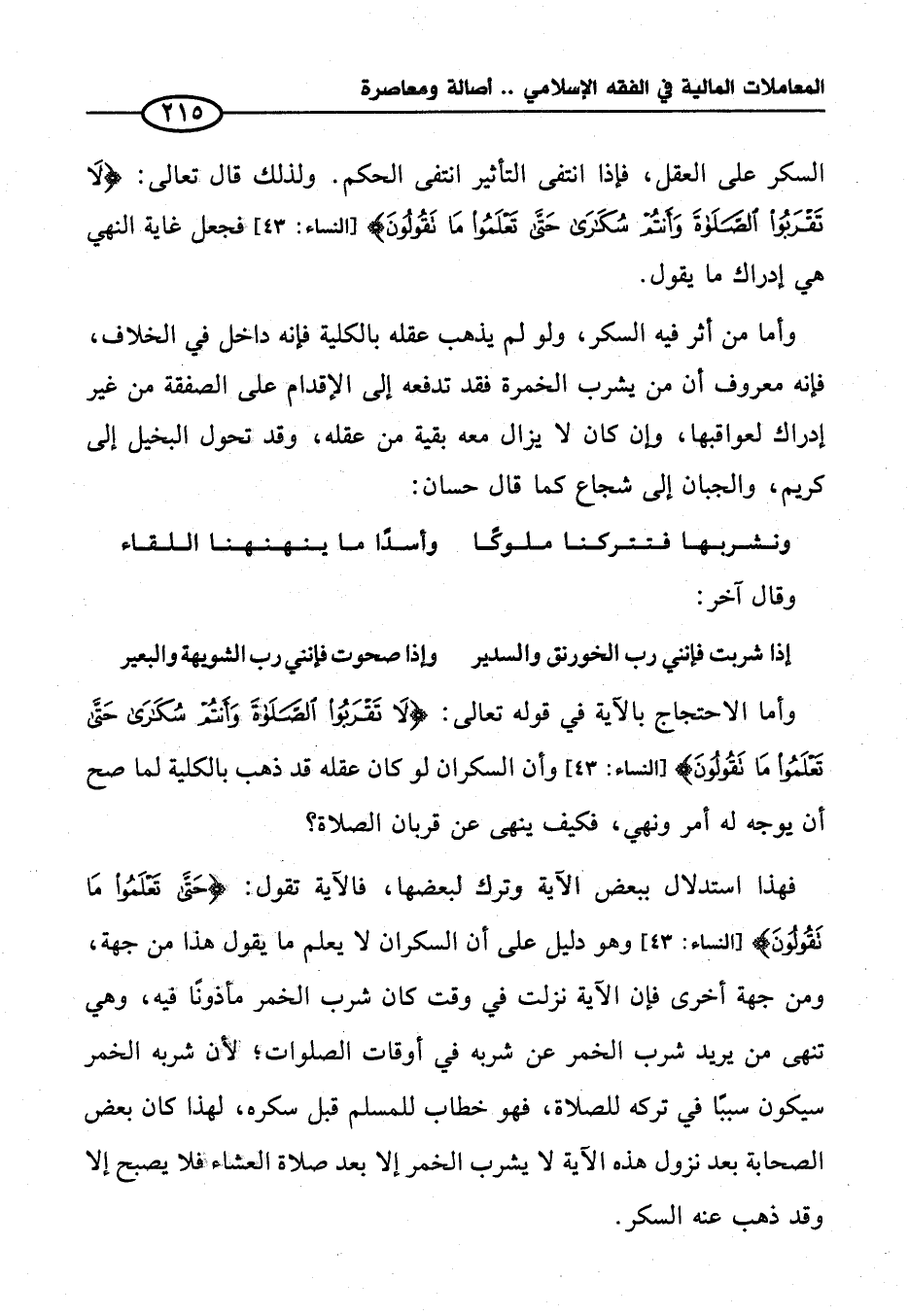 فهذا استدلال ببعض الآية وترك لبعضها، فالآية تقول: {حَتَّى تَعْلَمُوا مَا تَقُولُونَ} [النساء: ٤٣] وهو دليل على أن السكران لا يعلم ما يقول هذا من جهة، ومن جهة أخرى فإن الآية نزلت في وقت كان شرب الخمر مأذونًا فيه، وهي تنهى من يريد شرب الخمر عن شربه في أوقات الصلوات؛ لأن شربه الخمر سيكون سببًا في تركه للصلاة، فهو خطاب للمسلم قبل سكره، لهذا كان بعض الصحابة بعد نزول هذه الآية لا يشرب الخمر إلا بعد صلاة العشاء فلا يصبح إلا وقد ذهب عنه السكر.