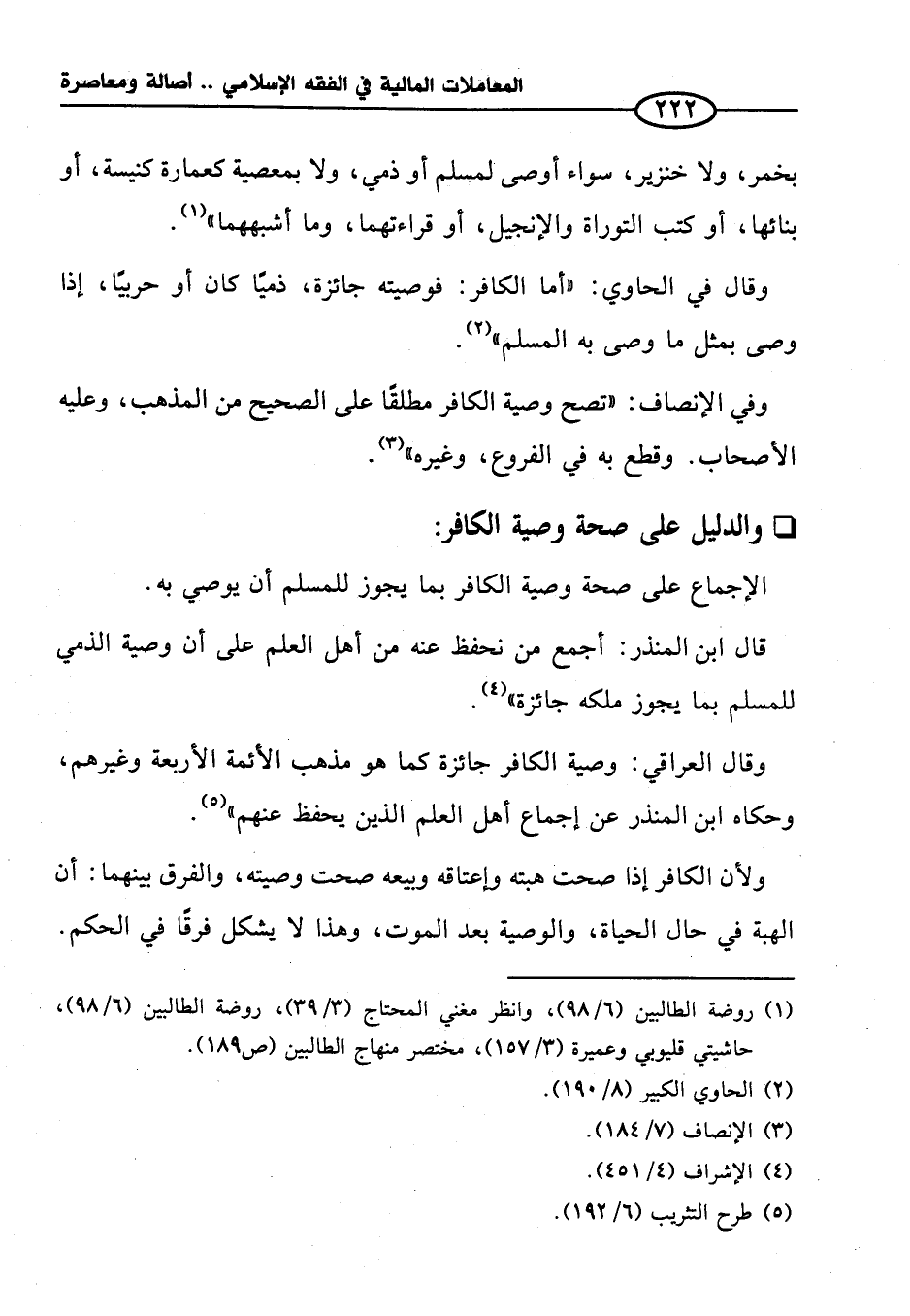 وقال العراقي: وصية الكافر جائزة كما هو مذهب الأئمة الأربعة وغيرهم، وحكاه ابن المنذر عن إجماع أهل العلم الذين يحفظ عنهم" (¬٥).