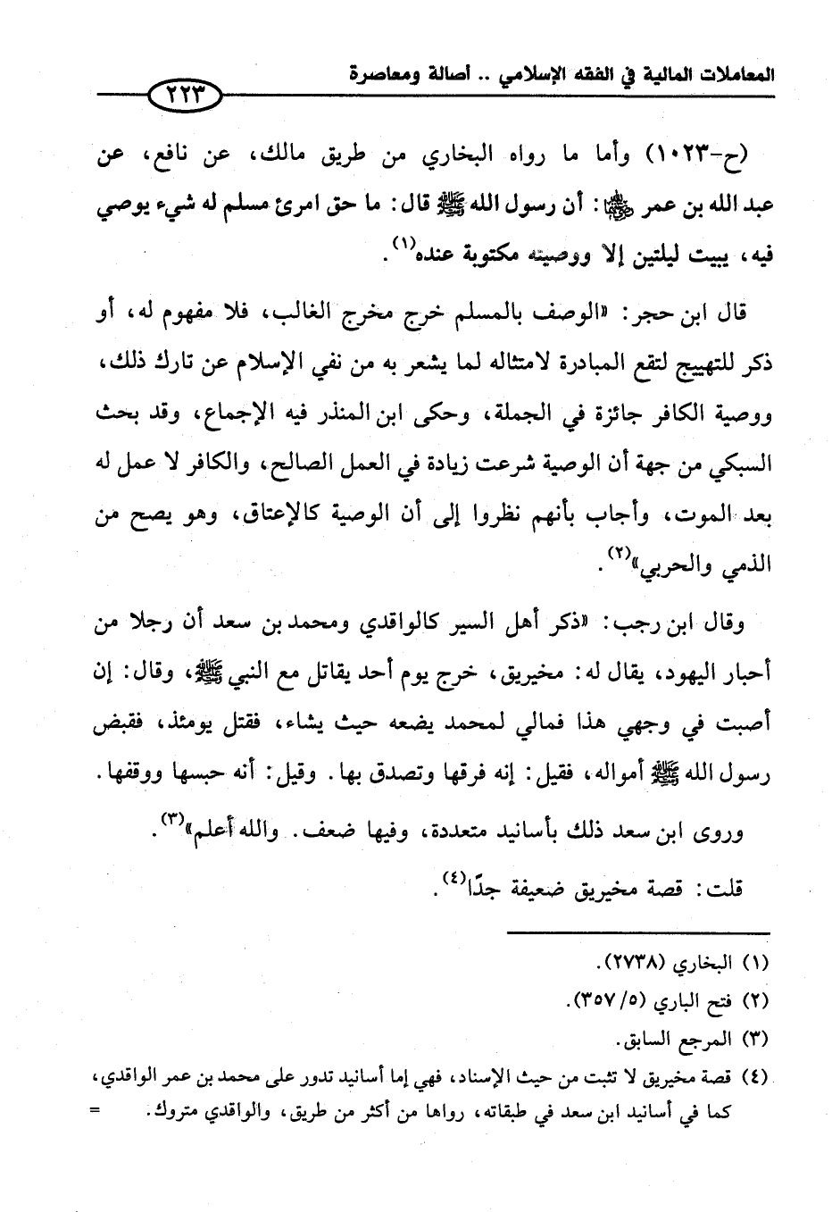 (ح -١٠٢٣) وأما ما رواه البخاري من طريق مالك، عن نافع، عن عبد الله بن عمر - رضي الله عنه -: أن رسول الله - صلى الله عليه وسلم - قال: ما حق امرئ مسلم له شيء يوصي فيه، يبيت ليلتين إلا ووصيته مكتوبة عنده (¬١).