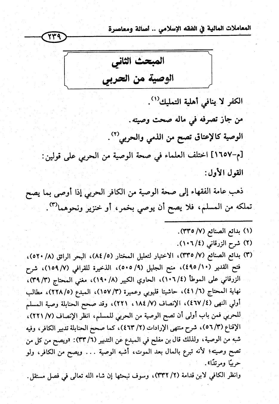 (¬٣) بدائع الصنائع (٧/ ٣٣٥)، الاختيار لتعليل المختار (٥/ ٨٤)، البحر الرائق (٨/ ٥٢٠)، فتح القدير (١٠/ ٤٩٥)، منح الجليل (٩/ ٥٠٥)، الذخيرة للقرافي (٧/ ١٥٩)، شرح الزرقاني على الموطأ (٤/ ١٠٦)، الحاوي الكبير (٨/ ١٩٠)، مغني المحتاج (٣/ ٣٩)، نهاية المحتاج (٦/ ٤١)، حاشيتا قليوبي وعميرة (٣/ ١٥٧)، المبدع (٥/ ٢٢٨) , مطالب أولي النهى (٤/ ٤٦٧)، الإنصاف (٧/ ١٨٤، ٢٢١)، وقد صحح الحنابلة وصية المسلم للحربي فمن باب أولى أن تصح الوصية من الحربي للمسلم، انظر الإنصاف (٧/ ٢٢١)، الإقناع (٣/ ٥٦)، شرح منتهى الإرادات (٢/ ٤٦٣)، كما صحح الحنابلة تدبير الكافر، وفيه شبه من الوصية، ولذلك قال بن مفلح في المبدع عن التدبير (٦/ ٣٣): "ويصح من كل من تصح وصيته؛ لأنه تبرع بالمال بعد الموت، أشبه الوصية ... ويصح من الكافر، ولو حريبًا ومرتدًا".