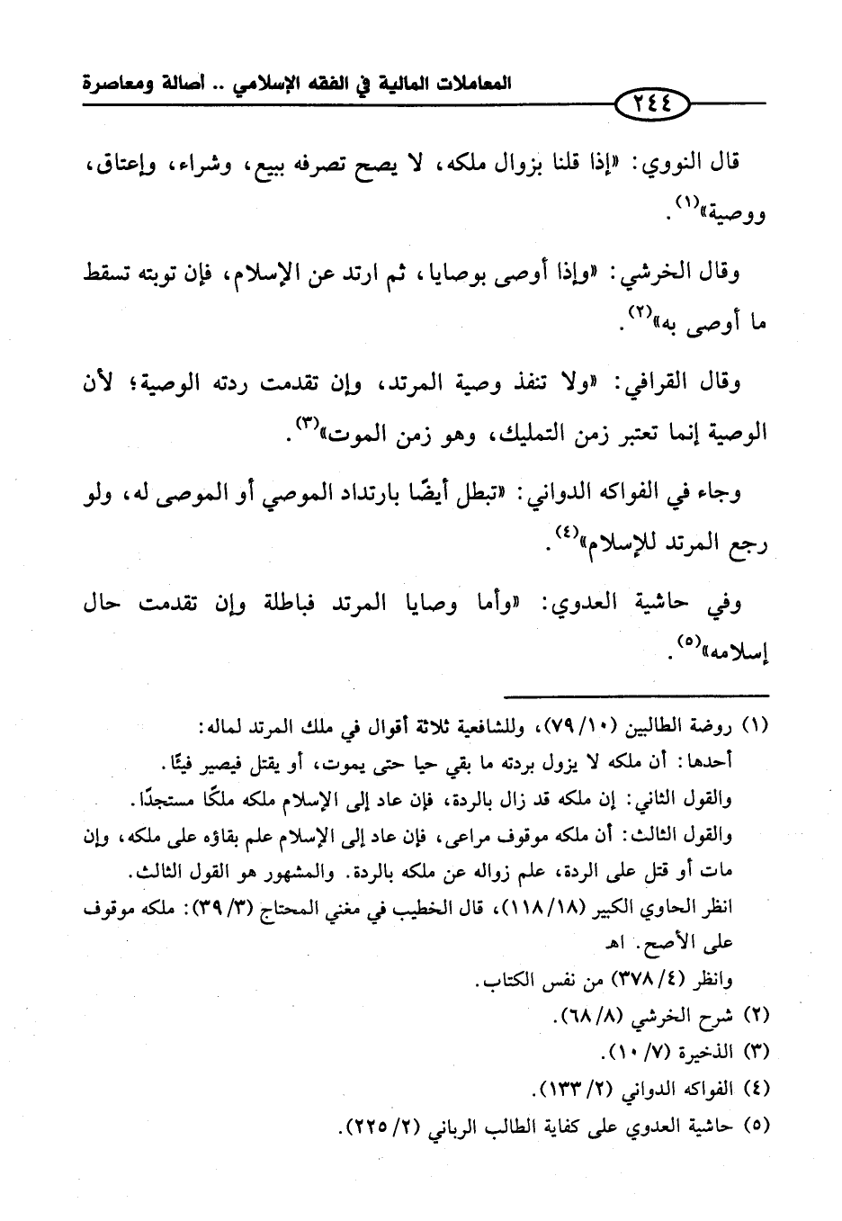 وفي حاشية العدوي: "وأما وصايا المرتد فباطلة وإن تقدمت حال إسلامه" (¬٥).