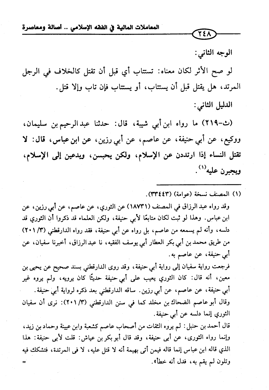 (ث -٢١٩) ما رواه ابن أبي شيبة، قال: حدثنا عبد الرحيم بن سليمان، ووكيع، عن أبي حنيفة، عن عاصم، عن أبي رزين، عن ابن عباس، قال: لا تقتل النساء إذا ارتددن عن الإِسلام، ولكن يحبسن، ويدعين إلى الإِسلام، ويجبرن عليه (¬١).