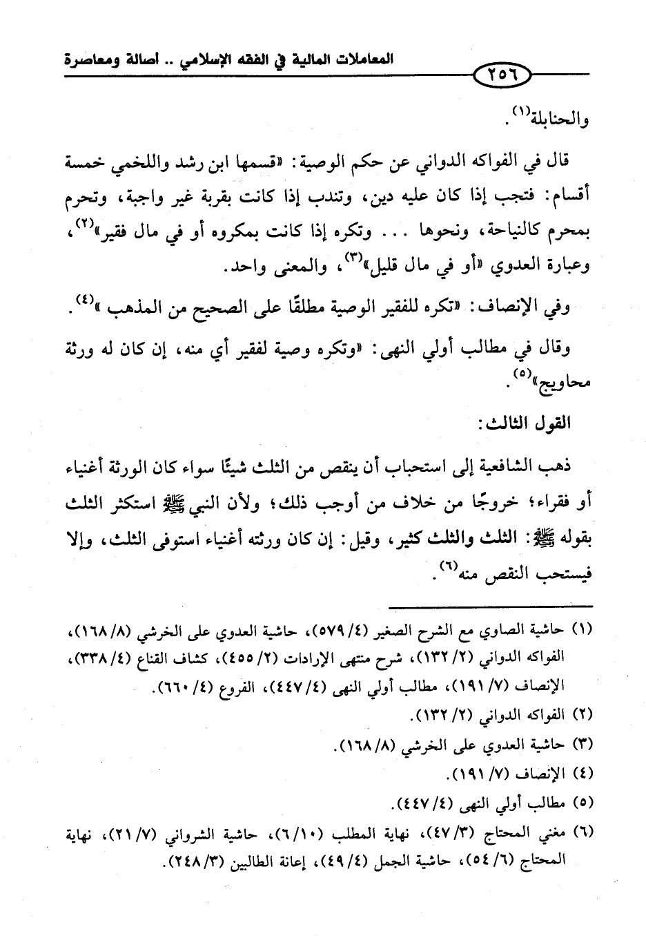 قال في الفواكه الدواني عن حكم الوصية: "قسمها ابن رشد واللخمي خمسة أقسام: فتجب إذا كان عليه دين، وتندب إذا كانت بقربة غير واجبة، وتحرم بمحرم كالنياحة، ونحوها ... وتكره إذا كانت بمكروه أو في مال فقير" (¬٢)، وعبارة العدوي "أو في مال قليل" (¬٣)، والمعنى واحد.