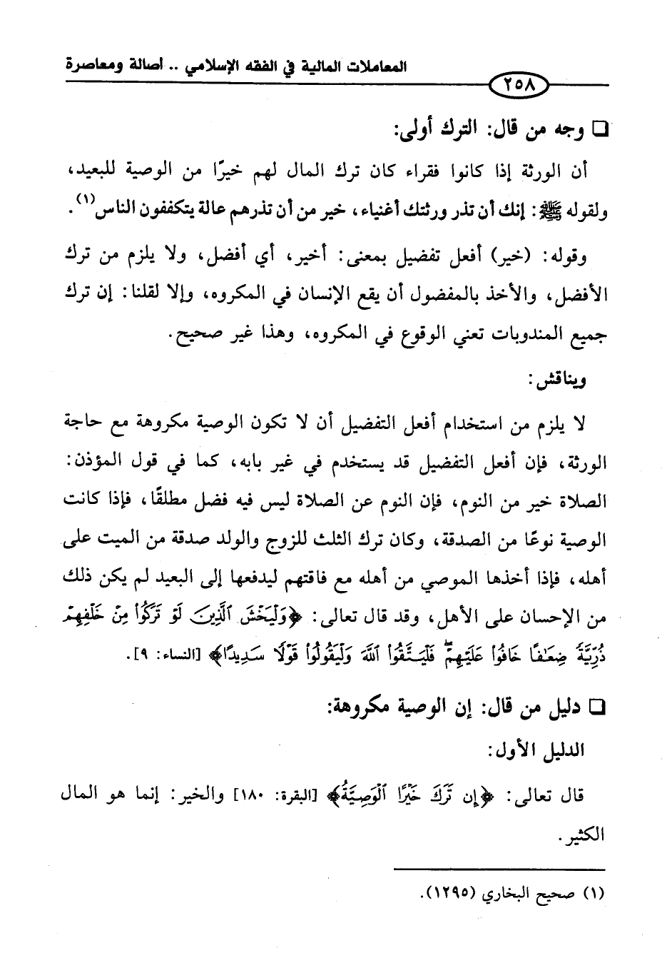 لا يلزم من استخدام أفعل التفضيل أن لا تكون الوصية مكروهة مع حاجة الورثة، فإن أفعل التفضيل قد يستخدم في غير بابه، كما في قول المؤذن: الصلاة خير من النوم، فإن النوم عن الصلاة ليس فيه فضل مطلقًا، فإذا كانت الوصية نوعًا من الصدقة، وكان ترك الثلث للزوج والولد صدقة من الميت على أهله، فإذا أخذها الموصي من أهله مع فاقتهم ليدفعها إلى البعيد لم يكن ذلك من الإحسان على الأهل، وقد قال تعالى: {وَلْيَخْشَ الَّذِينَ لَوْ تَرَكُوا مِنْ خَلْفِهِمْ ذُرِّيَّةً ضِعَافًا خَافُوا عَلَيْهِمْ فَلْيَتَّقُوا اللَّهَ وَلْيَقُولُوا قَوْلًا سَدِيدًا} [النساء: ٩].