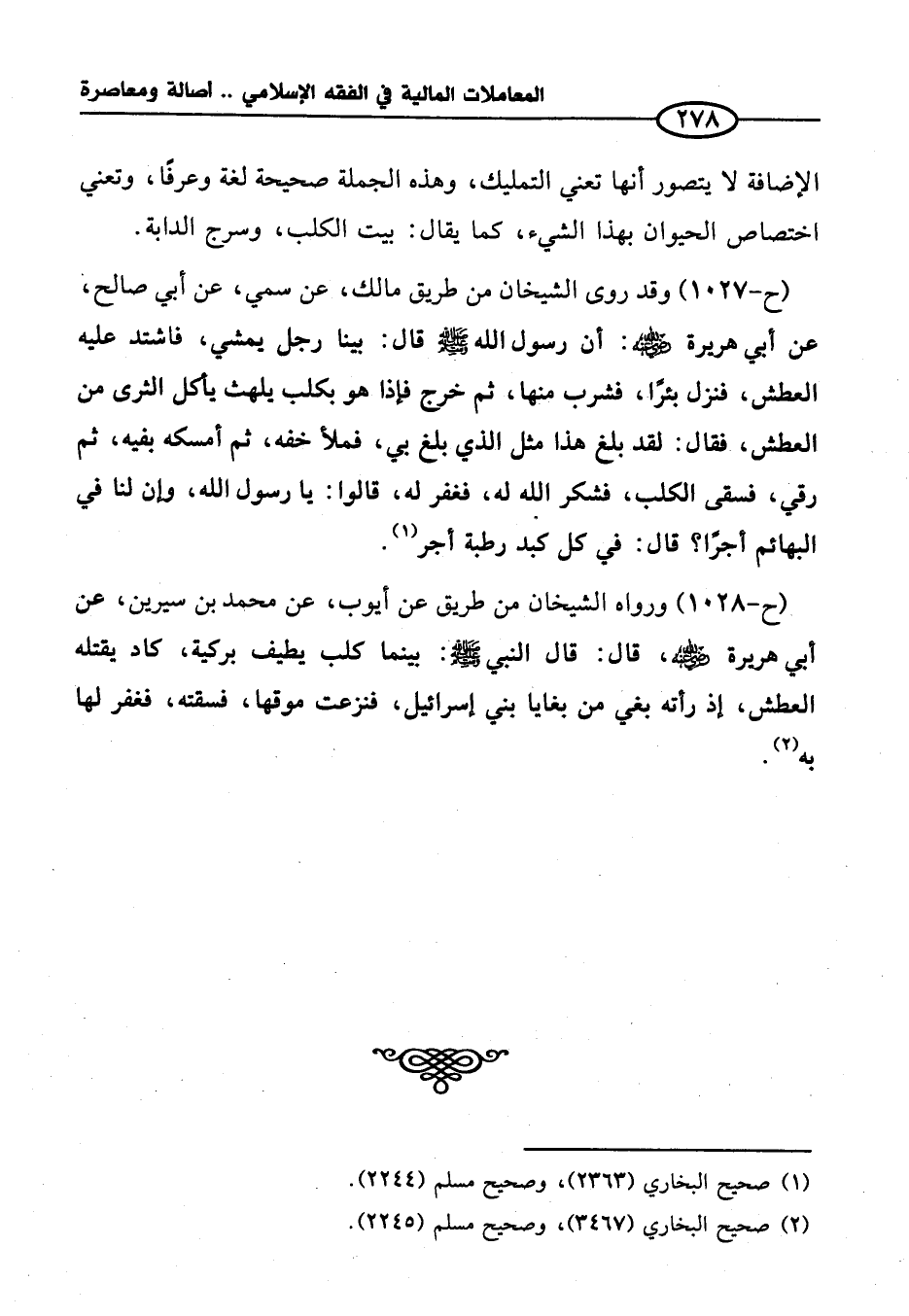 (ح -١٠٢٧) وقد روى الشيخان من طريق مالك، عن سمي، عن أبي صالح، عن أبي هريرة - رضي الله عنه -: أن رسول الله - صلى الله عليه وسلم - قال: بينا رجل يمشي، فاشتد عليه العطش، فنزل بئرًا، فشرب منها، ثم خرج فإذا هو بكلب يلهث يأكل الثرى من العطش، فقال: لقد بلغ هذا مثل الذي بلغ بي، فملأ خفه، ثم أمسكه بفيه، ثم رقي، فسقى الكلب، فشكر الله له، فغفر له، قالوا: با رسول الله، وإن لنا في البهائم أجرًا؟ قال: في كل كبد رطبة أجر (¬١).