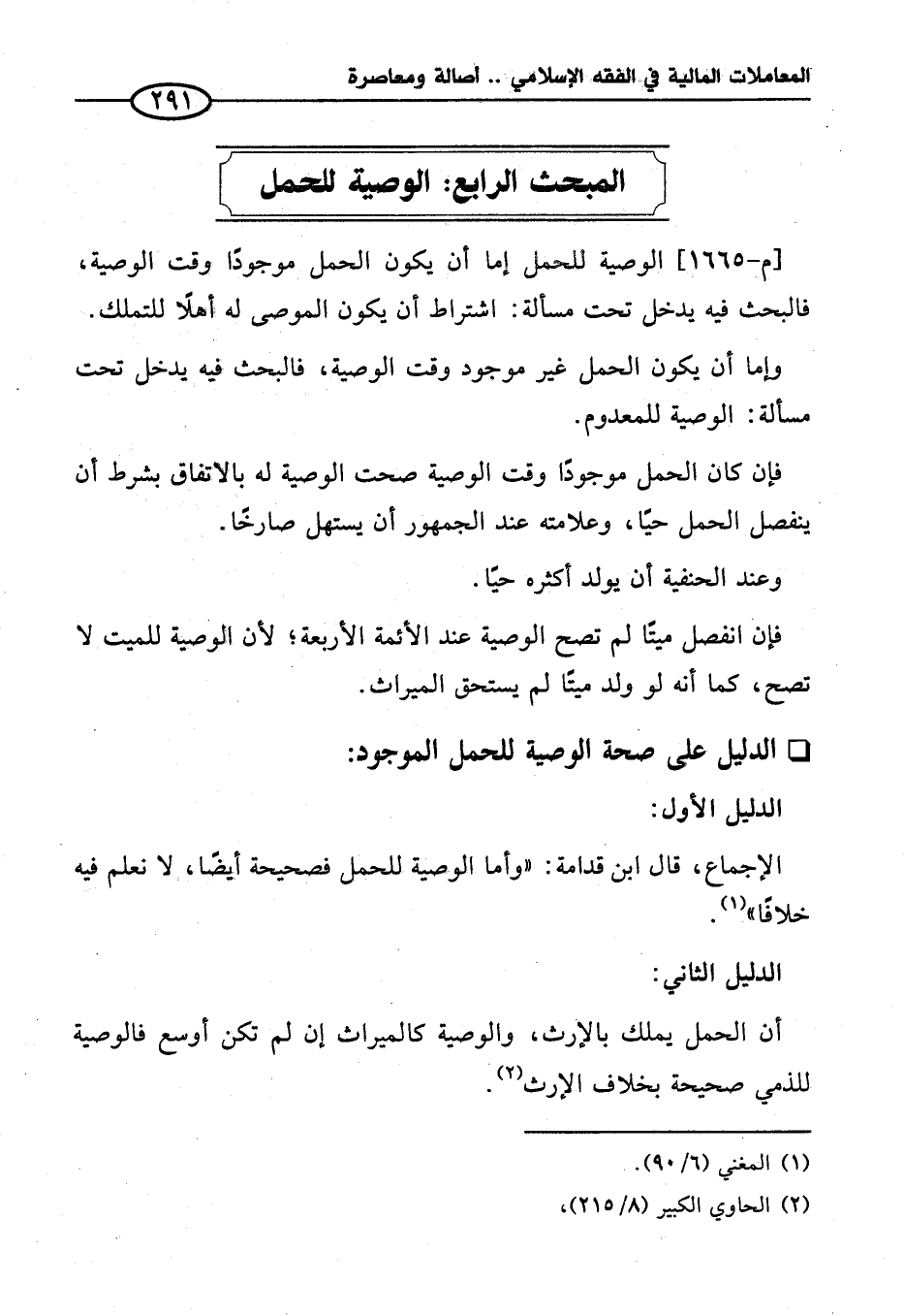 [م - ١٦٦٥] الوصية للحمل إما أن يكون الحمل موجودًا وقت الوصية، فالبحث فيه يدخل تحت مسألة: اشتراط أن يكون الموصى له أهلاً للتملك.