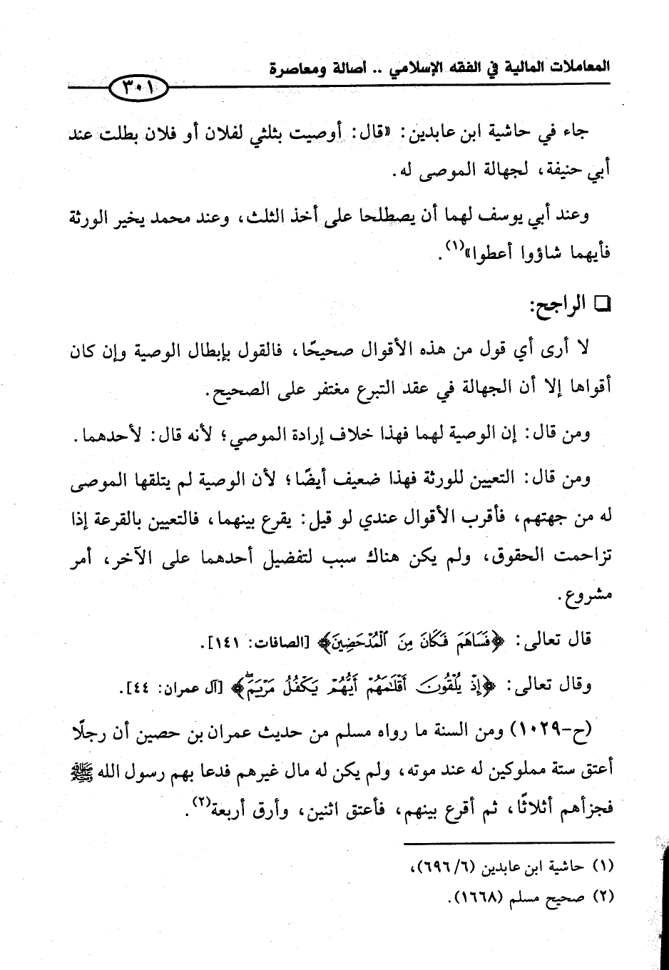 (ح -١٠٢٩) ومن السنة ما رواه مسلم من حديث عمران بن حصين أن رجلاً أعتق ستة مملوكين له عند موته، ولم يكن له مال غيرهم فدعا بهم رسول الله - صلى الله عليه وسلم - فجزأهم أثلاثًا، ثم أقرع بينهم، فأعتق اثنين، وأرق أربعة (¬٢).