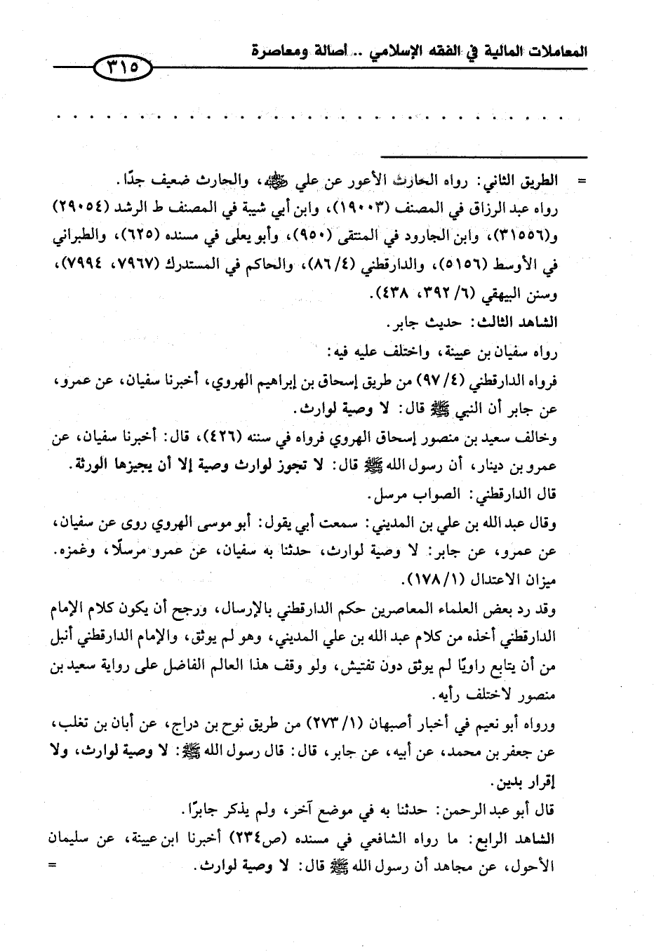 فرواه الدارقطني (٤/ ٩٧) من طريق إسحاق بن إبراهيم الهروي، أخبرنا سفيان، عن عمرو، عن جابر أن النبي - صلى الله عليه وسلم - قال: لا وصية لوارث.