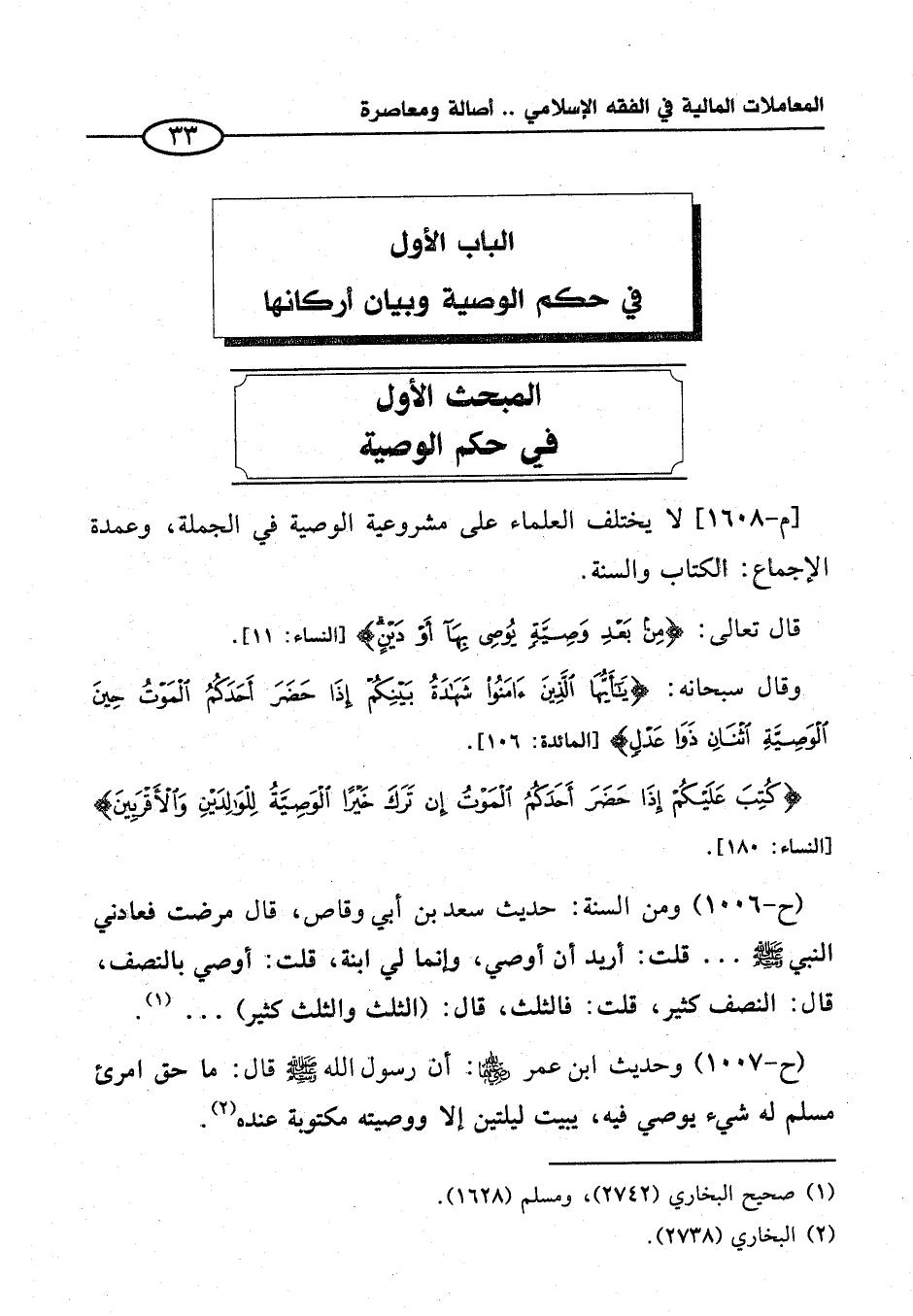 (ح -١٠٠٦) ومن السنة: حديث سعد بن أبي وقاص، قال مرضت فعادني النبي - صلى الله عليه وسلم - ... قلت: أريد أن أوصي، وإنما لي ابنة، قلت: أوصي بالنصف، قال: النصف كثير، قلت: فالثلث، قال: (الثلث والثلث كثير) ... (¬١).