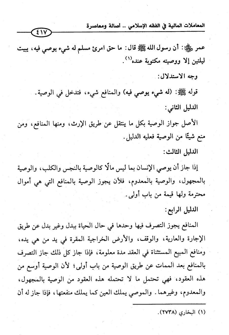 عمر - رضي الله عنه -: أن رسول الله - صلى الله عليه وسلم - قال: ما حق امرئ مسلم له شيء يوصي فيه، يبيت ليلتين إلا ووصيته مكتوية عنده (¬١).