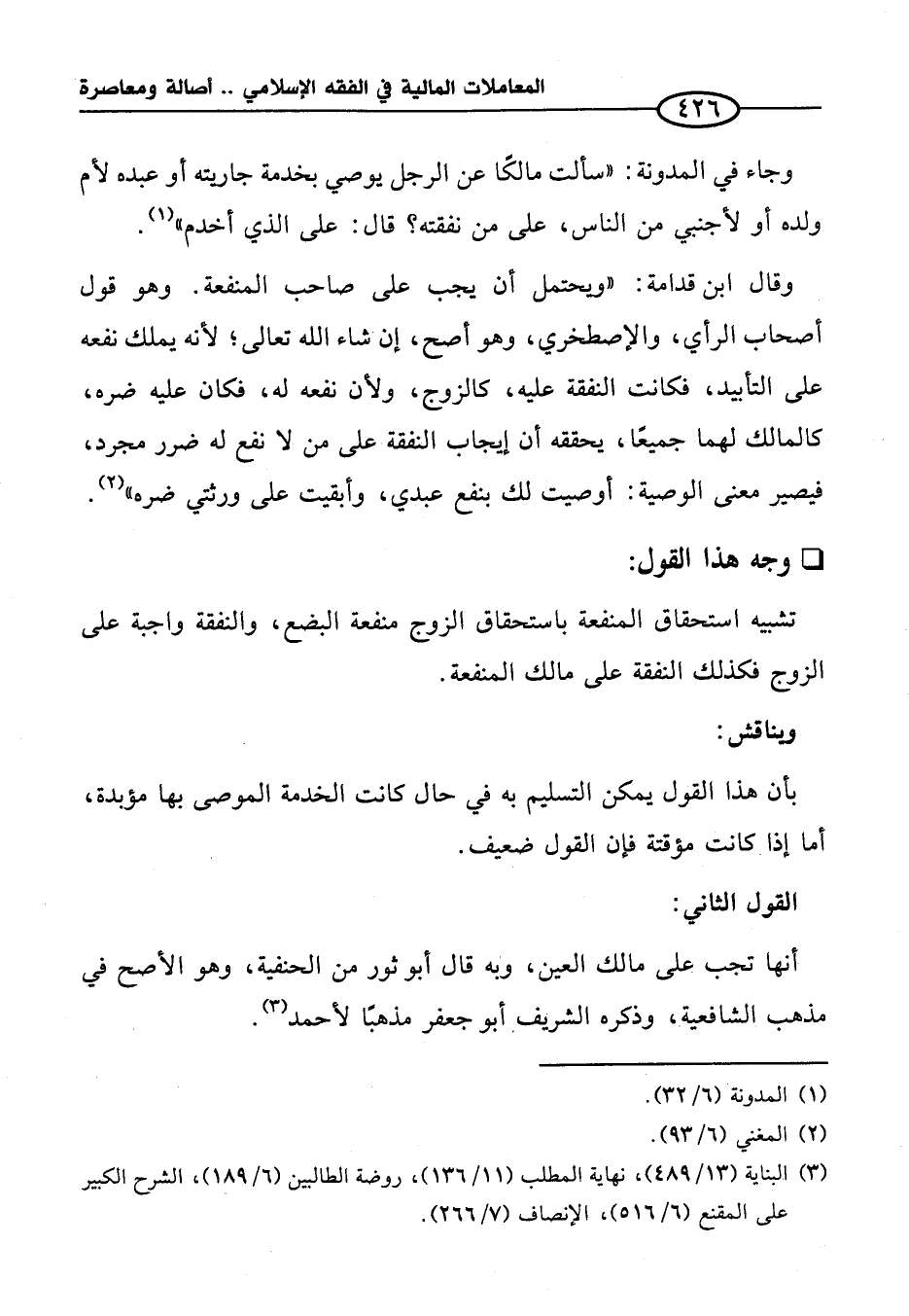 وجاء في المدونة: "سألت مالكًا عن الرجل يوصي بخدمة جاريته أو عبده لأم ولده أو لأجنبي من الناس، على من نفقته؟ قال: على الذي أخدم" (¬١).