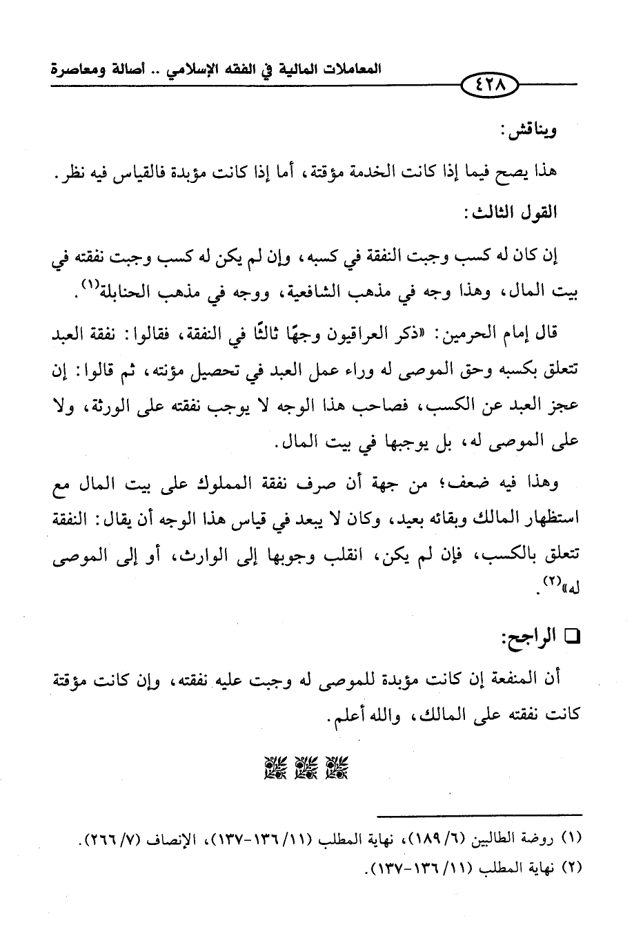 وهذا فيه ضعف؛ من جهة أن صرف نفقة المملوك على بيت المال مع استظهار المالك وبقائه بعيد، وكان لا يبعد في قياس هذا الوجه أن يقال: النفقة تتعلق بالكسب، فإن لم يكن، انقلب وجوبها إلى الوارث، أو إلى الموصى له" (¬٢).