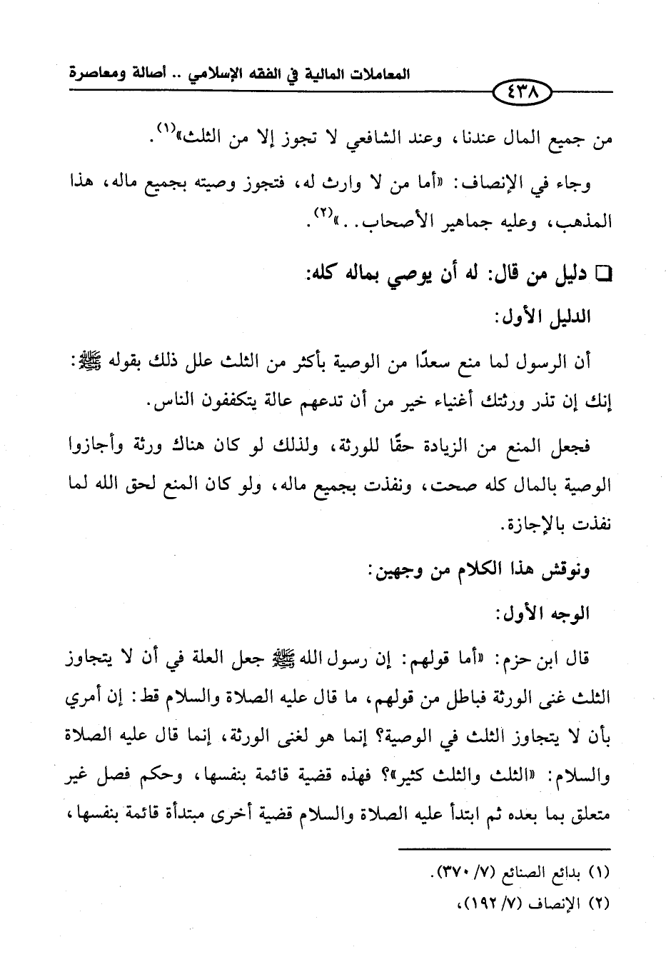 قال ابن حزم: "أما قولهم: إن رسول الله - صلى الله عليه وسلم - جعل العلة في أن لا يتجاوز الثلث غنى الورثة فباطل من قولهم، ما قال عليه الصلاة والسلام قط: إن أمري بأن لا يتجاوز الثلث في الوصية؟ إنما هو لغنى الورثة، إنما قال عليه الصلاة والسلام: "الثلث والثلث كثير"؟ فهذه قضية قائمة بنفسها، وحكم فصل غير متعلق بما بعده ثم ابتدأ عليه الصلاة والسلام قضية أخرى مبتدأة قائمة بنفسها،