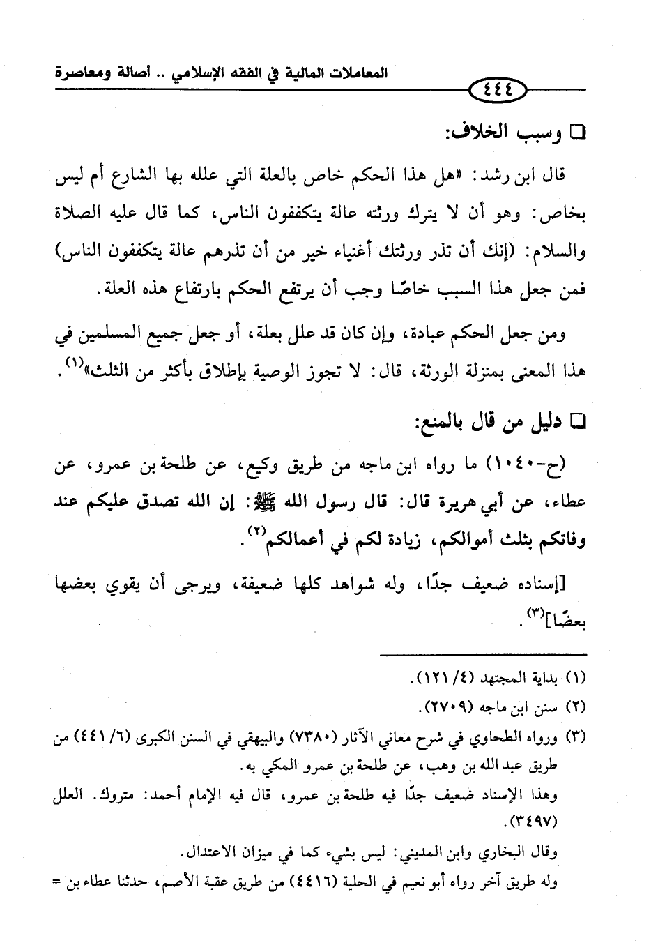 قال ابن رشد: "هل هذا الحكم خاص بالعلة التي علله بها الشارع أم ليس بخاص: وهو أن لا يترك ورثته عالة يتكففون الناس، كما قال عليه الصلاة والسلام: (إنك أن تذر ورثتك أغنياء خير من أن تذرهم عالة يتكففون الناس) فمن جعل هذا السبب خاصًا وجب أن يرتفع الحكم بارتفاع هذه العلة.