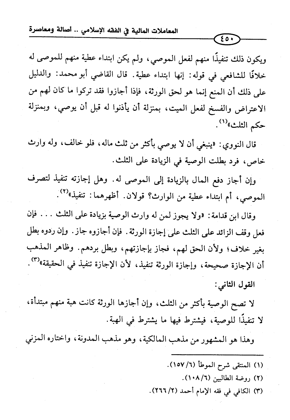 وقال ابن قدامة: "ولا يجوز لمن له وارث الوصية بزيادة على الثلث ... فإن فعل وقف الزائد على الثلث على إجازة الورثة. فإن أجازوه جاز. وإن ردوه بطل بغير خلاف؛ ولأن الحق لهم، فجاز بإجازتهم، وبطل بردهم. وظاهر المذهب أن الإجازة صحيحة، وإجازة الورثة تنفيذ؛ لأن الإجازة تنفيذ في الحقيقة" (¬٣).