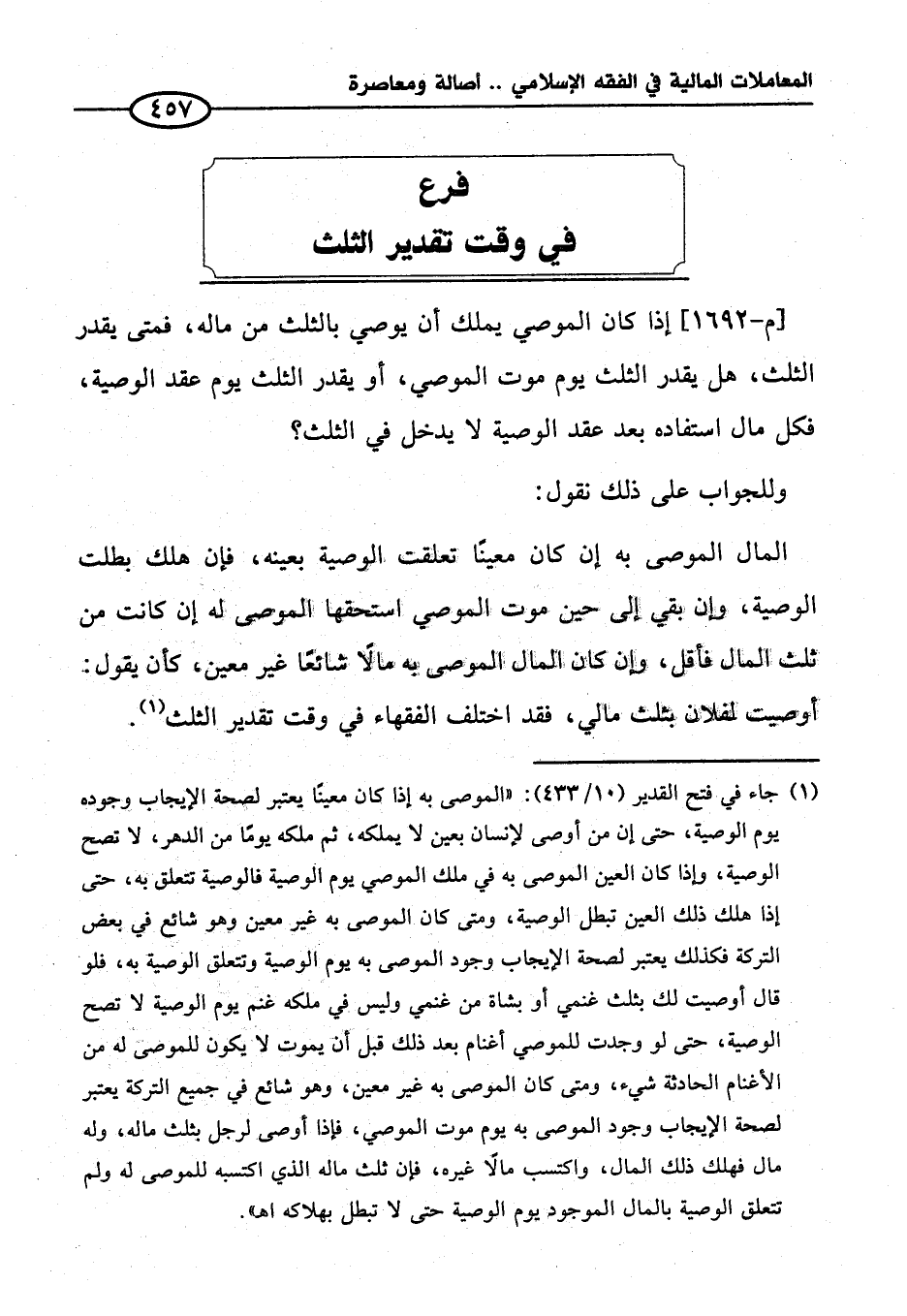 [م - ١٦٩٢] إذا كان الموصي يملك أن يوصي بالثلث من ماله، فمتى يقدر الثلث، هل يقدر الثلث يوم موت الموصي، أو يقدر الثلث يوم عقد الوصية، فكل مال استفاده بعد عقد الوصية لا يدخل في الثلث؟