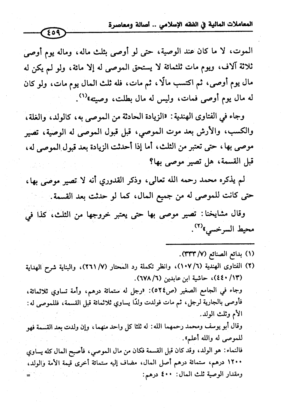 فالنماء: هو الولد، وقد كان قبل القسمة فكان من مال الموصي، فأصبح المال كله يساوي ١٢٠٠ درهم، ستمائة درهم أصل المال، مضاف إليه ستمائة أخرى قيمة الأمة والولد، ومقدار الوصية ثلث المال: ٤٠٠ درهم: =