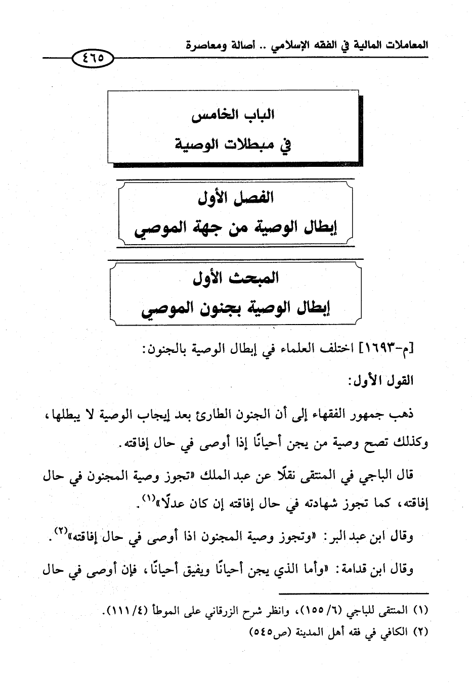 قال الباجي في المنتقى نقلاً عن عبد الملك "تجوز وصية المجنون في حال إفاقته، كما تجوز شهادته في حال إفاقته إن كان عدلاً" (¬١).