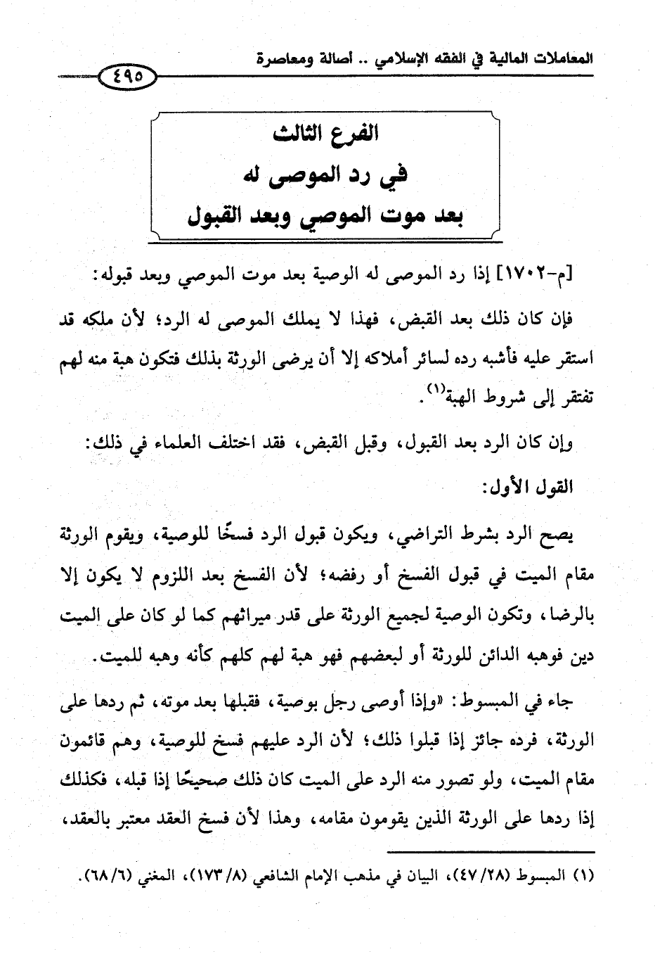 الفرع الثالث في رد الموصى له بعد موت الموصي وبعد القبول
