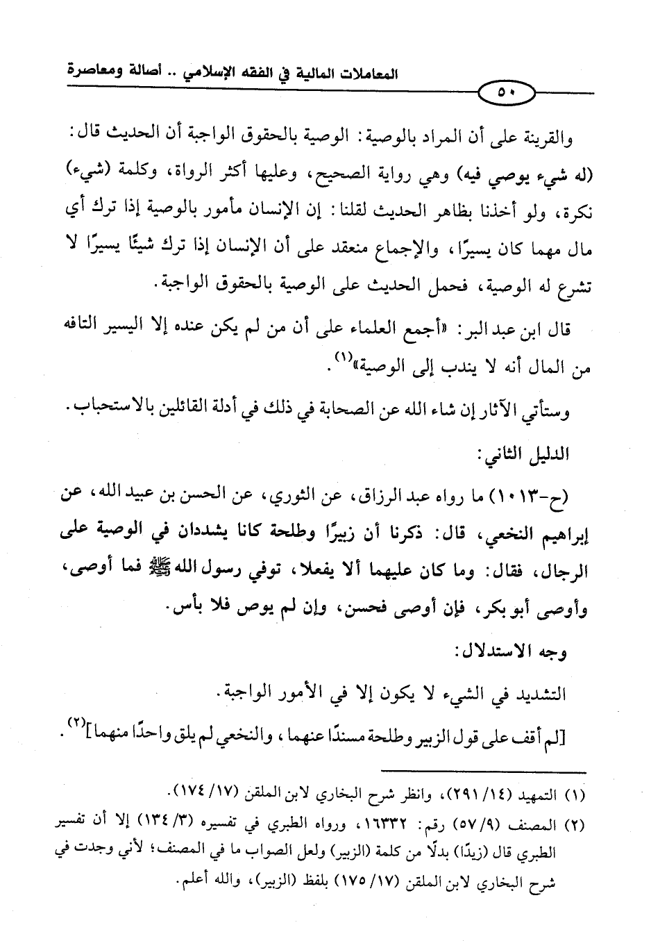 (ح -١٠١٣) ما رواه عبد الرزاق، عن الثوري، عن الحسن بن عبيد الله، عن إبراهيم النخعي، قال: ذكرنا أن زبيرًا وطلحة كانا يشددان في الوصية على الرجال، فقال: وما كان عليهما ألا يفعلا، توفي رسول الله - صلى الله عليه وسلم - فما أوصى، وأوصى أبو بكر، فإن أوصى فحسن، وإن لم يوص فلا بأس.