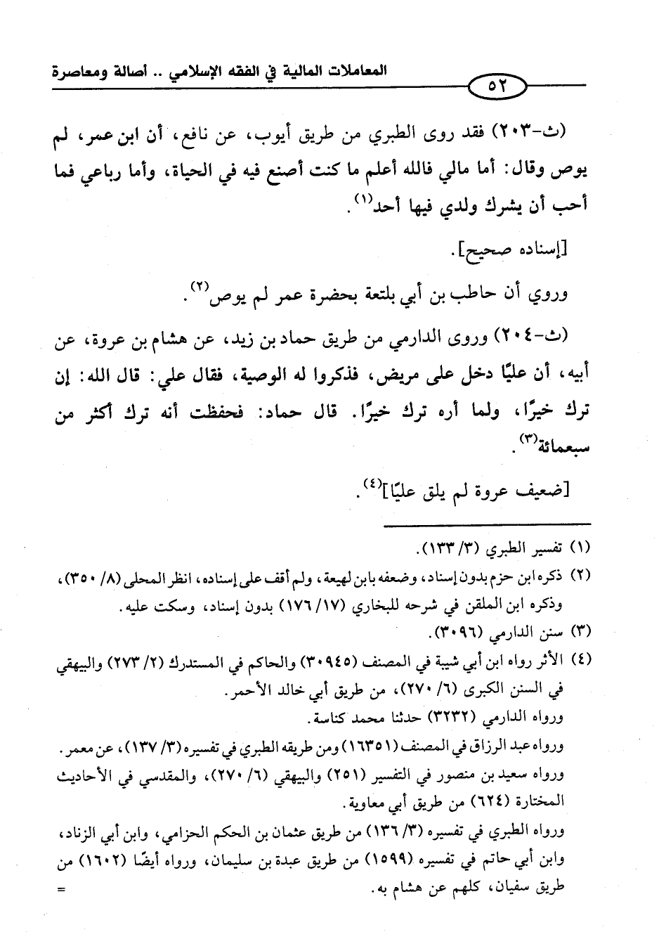 (ث -٢٠٤) وروى الدارمي من طريق حماد بن زيد، عن هشام بن عروة، عن أبيه، أن عليًا دخل على مريض، فذكروا له الوصية، فقال علي: قال الله: إن ترك خيرًا, ولما أراه ترك خيرًا. قال حماد: فحفظت أنه ترك أكثر من سبعمائة (¬٣).