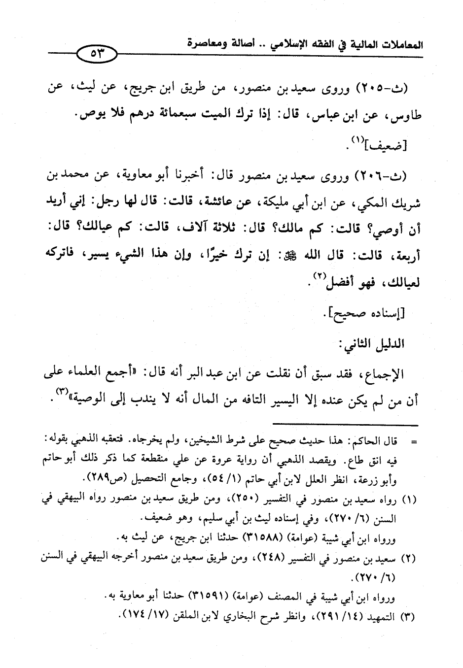 (ث -٢٠٦) وروى سعيد بن منصور قال: أخبرنا أبو معاوية، عن محمَّد بن شريك المكي، عن ابن أبي مليكة، عن عائشة، قالت: قال لها رجل: إني أريد أن أوصي؟ قالت: كم مالك؟ قال: ثلاثة آلاف، قالت: كم عيالك؟ قال: أربعة، قالت: قال الله - عَزَّ وَجَلَّ -: إن ترك خيرًا، وإن هذا الشيء يسير، فاتركه لعيالك، فهو أفضل (¬٢).