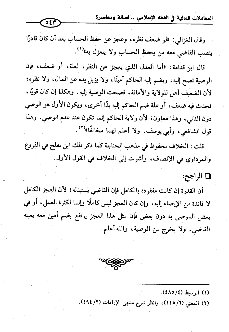 وقال الغزالي: "لو ضعف نظره، وعجز عن حفظ الحساب بعد أن كان قادرًا ينصب القاضي معه من يحفظ الحساب ولا ينعزل به" (¬١).