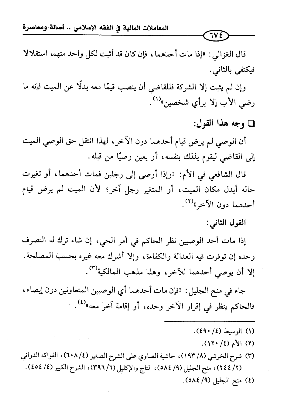 جاء في منح الجليل: "فإن مات أحدهما أي الوصيين المتعاونين دون إيصاء، فالحاكم ينظر في إقرار الآخر وحده، أو إقامة آخر معه" (¬٤).