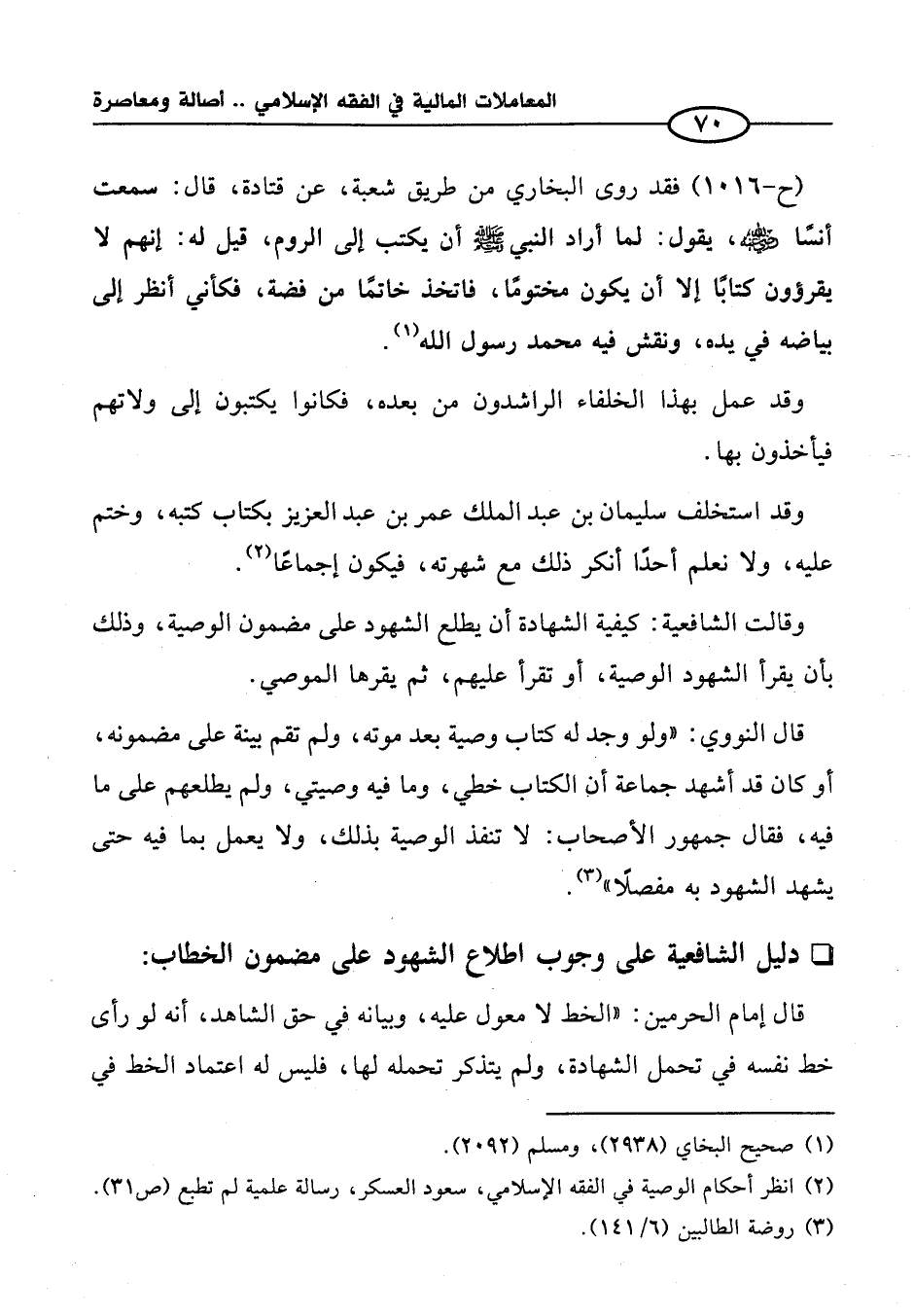 (ح -١٠١٦) فقد روى البخاري من طريق شعبة، عن قتادة، قال: سمعت أنسًا - صلى الله عليه وسلم -، يقول: لما أراد النبي - صلى الله عليه وسلم - أن يكتب إلى الروم، قيل له: إنهم لا يقرؤون كتابًا إلا أن يكون مختومًا، فاتخذ خاتمًا من فضة، فكأني أنظر إلى بياضه في يده، ونقش فيه محمَّد رسول الله (¬١).
