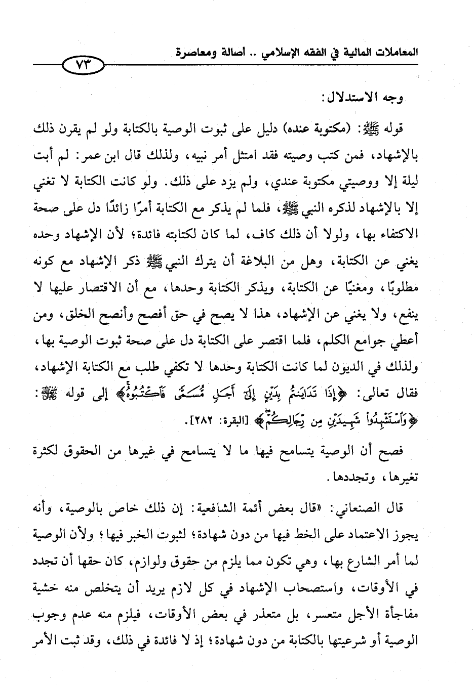 قال الصنعاني: "قال بعض أئمة الشافعية: إن ذلك خاص بالوصية، وأنه يجوز الاعتماد على الخط فيها من دون شهادة؛ لثبوت الخبر فيها؛ ولأن الوصية لما أمر الشارع بها، وهي تكون مما يلزم من حقوق ولوازم، كان حقها أن تجدد في الأوقات، واستصحاب الإشهاد في كل لازم يريد أن يتخلص منه خشية مفاجأة الأجل متعسر، بل متعذر في بعض الأوقات، فيلزم منه عدم وجوب الوصية أو شرعيتها بالكتابة من دون شهادة؛ إذ لا فائدة في ذلك، وقد ثبت الأمر