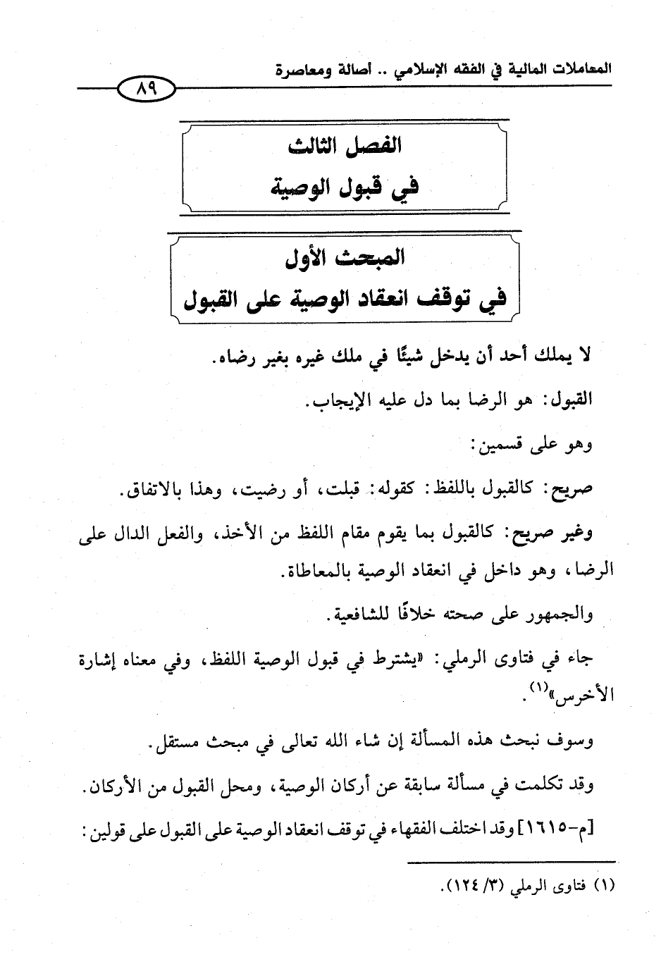 المبحث الأول في توقف انعقاد الوصية على القبول