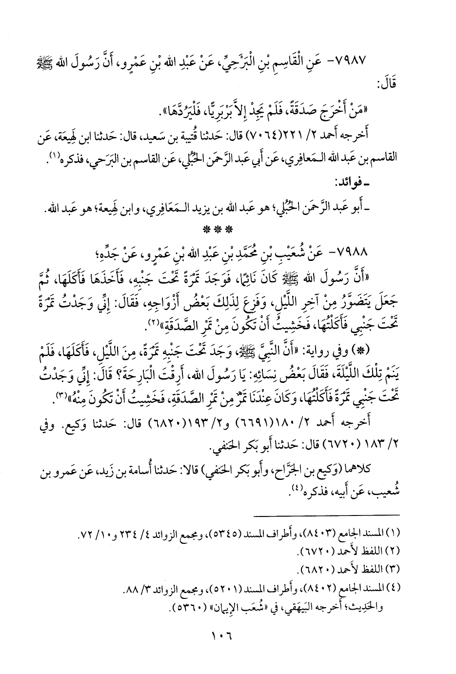٧٩٨٧ - عن القاسم بن البرحي، عن عبد الله بن عَمرو، أن رسول الله صَلى الله عَليه وسَلم قال:
