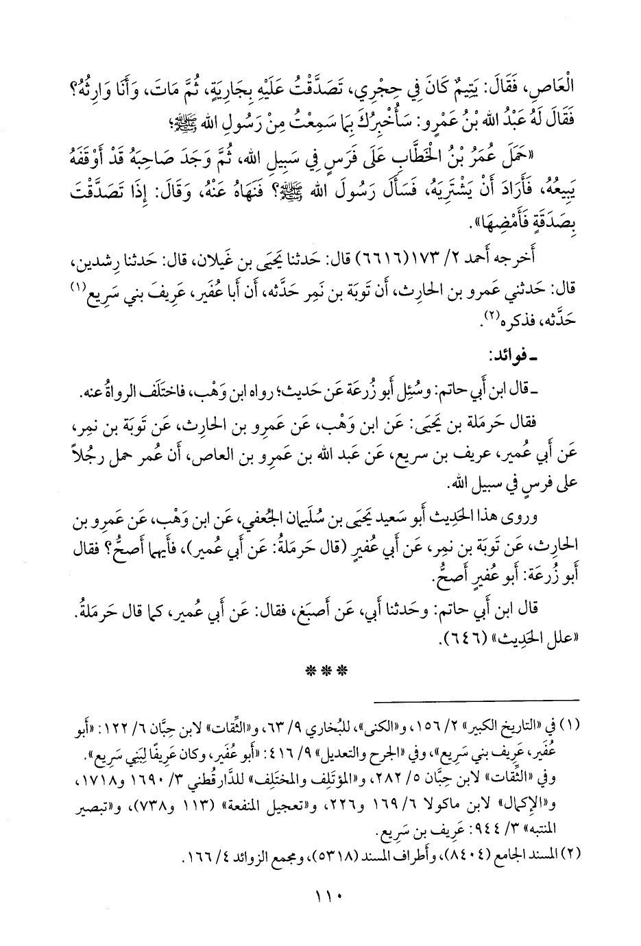 فقال حَرملة بن يحيى: عن ابن وهب، عن عَمرو بن الحارث، عن توبة بن نمر، عن أبي عمير، عَرِيف بن سريع، عن عبد الله بن عَمرو بن العاص، أن عمر حمل رجلا على فرس في سبيل الله.