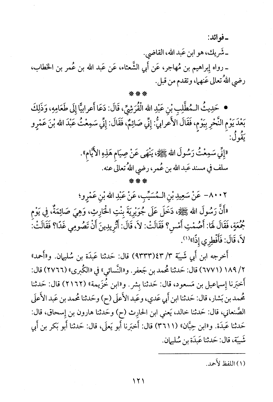 • حديث المطلب بن عبد الله القرشي، قال: دعا أعرابيا إلى طعامه، وذلك بعد يوم النحر بيوم، فقال الأعرابي: إني صائم، فقال: إني سمعت عبد الله بن عَمرو يقول: