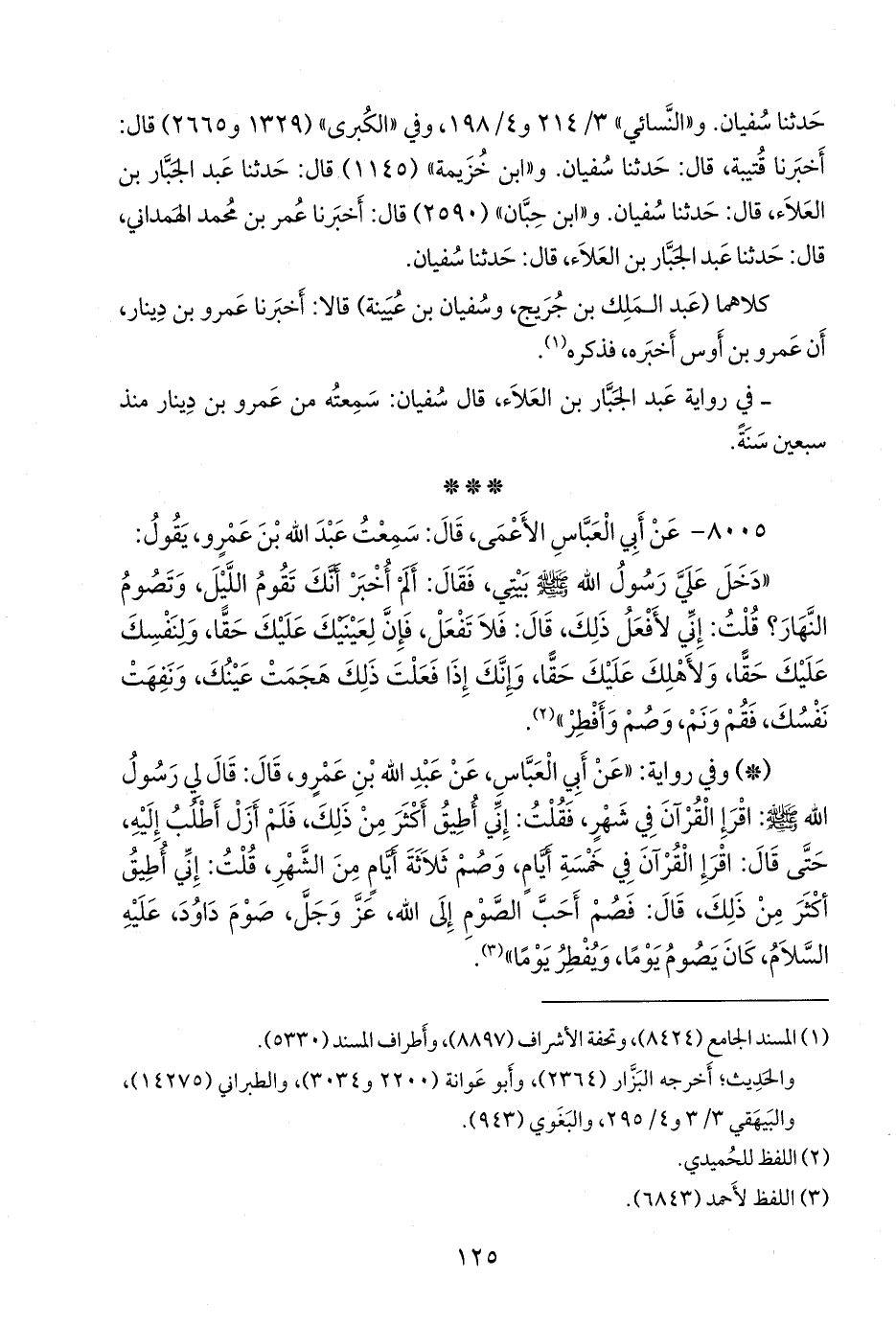 - وفي رواية: «عن أبي العباس الشاعر، أنه سمع عبد الله بن عَمرو، يقول: بلغ النبي صَلى الله عَليه وسَلم أني أصوم أسرد، وأصلي الليل، قال: فإما أرسل إلي، وإما لقيته، فقال: ألم أخبر أنك تصوم ولا تفطر، وتصلي الليل؟! فلا تفعل، فإن لعينك حظا، ولنفسك حظا، ولأهلك حظا، فصم وأفطر، وصل ونم، وصم من كل عشرة أيام يوما، ولك أجر تسعة، قال: إني أجدني أقوى من ذلك يا نبي الله، قال: فصم صيام داود، قال: فكيف كان داود يصوم يا نبي الله؟ قال: كان يصوم يوما، ويفطر يوما، ولا يفر إذا لاقى، قال: من لي بهذه يا نبي الله؟».
