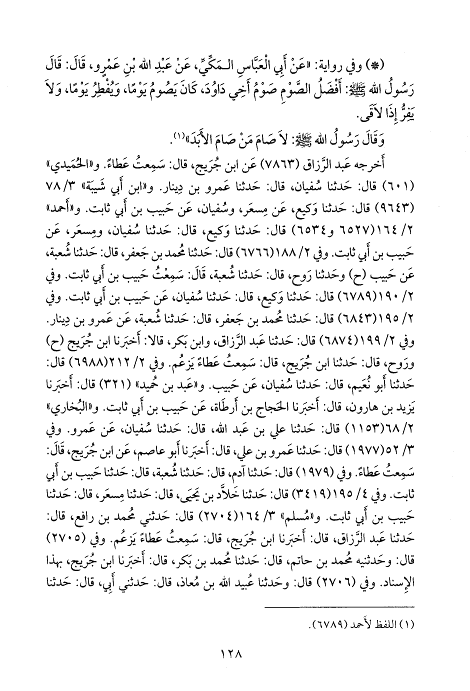 أخرجه عبد الرزاق (٧٨٦٣) عن ابن جُريج، قال: سمعت عطاء. و «الحميدي» (٦٠١) قال: حدثنا سفيان، قال: حدثنا عَمرو بن دينار. و «ابن أبي شيبة» (٩٦٤٣) قال: حدثنا وكيع، عن مِسعَر، وسفيان، عن حبيب بن أبي ثابت. و «أحمد» ٢/ ١٦٤ (٦٥٢٧ و ٦٥٣٤) قال: حدثنا وكيع، قال: حدثنا سفيان، ومسعر، عن حبيب بن أبي ثابت. وفي ٢/ ١٨٨ (٦٧٦٦) قال: حدثنا محمد بن جعفر، قال: حدثنا شعبة، عن حبيب (ح) وحدثنا روح، قال: حدثنا شعبة، قال: سمعت حبيب بن أبي ثابت. وفي ٢/ ١٩٠ (٦٧٨٩) قال: حدثنا وكيع، قال: حدثنا سفيان، عن حبيب بن أبي ثابت. وفي ٢/ ١٩٥ (٦٨٤٣) قال: حدثنا محمد بن جعفر، قال: حدثنا شعبة، عن عَمرو بن دينار. وفي ٢/ ١٩٩ (٦٨٧٤) قال: حدثنا عبد الرزاق، وابن بكر، قالا: أخبرنا ابن جُريج (ح) وروح، قال: حدثنا ابن جُريج، قال: سمعت عطاء يزعم. وفي ٢/ ٢١٢ (٦٩٨٨) قال: حدثنا أَبو نُعيم، قال: حدثنا سفيان، عن حبيب. و «عَبد بن حُميد» (٣٢١) قال: أخبرنا يزيد بن هارون، قال: أخبرنا الحجاج بن أَرطَاة، عن حبيب بن أبي ثابت. و «البخاري» ٢/ ٥٤ (١١٥٣) قال: حدثنا علي بن عبد الله، قال: حدثنا سفيان، عن عَمرو. وفي ٣/ ٤٠ (١٩٧٧) قال: حدثنا عَمرو بن علي، قال: أخبرنا أَبو عاصم، عن ابن جُريج، قال: سمعت عطاء. وفي (١٩٧٩) قال: حدثنا آدم، قال: حدثنا شعبة، قال: حدثنا حبيب بن أبي ثابت. وفي ٤/ ١٦٠ (٣٤١٩) قال: حدثنا خلاد بن يحيى، قال: حدثنا مسعر، قال: حدثنا حبيب بن أبي ثابت. و «مسلم» ٣/ ١٦٤ (٢٧٠٤) قال: حدثني محمد بن رافع، قال: حدثنا عبد الرزاق، قال: أخبرنا ابن جُريج، قال: سمعت عطاء يزعم. وفي (٢٧٠٥) قال: وحدثنيه محمد بن حاتم، قال: حدثنا محمد بن بكر، قال: أخبرنا ابن جُريج، بهذا الإسناد. وفي (٢٧٠٦) قال: وحدثنا عُبيد الله بن معاذ، قال: حدثني أبي، قال: حدثنا