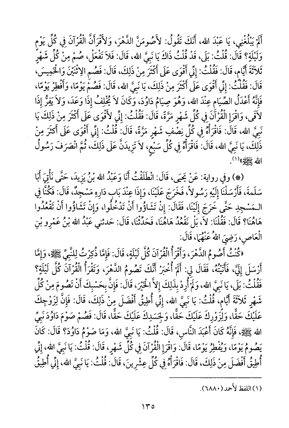 «كنت أصوم الدهر، وأقرأ القرآن كل ليلة، قال: فإما ذكرت للنبي صَلى الله عَليه وسَلم وإما أرسل إلي، فأتيته، فقال لي: ألم أخبر أنك تصوم الدهر، وتقرأ القرآن كل ليلة؟ فقلت: بلى، يا نبي الله، ولم أرد بذلك إلا الخير، قال: فإن بحسبك أن تصوم من كل شهر ثلاثة أيام، قلت: يا نبي الله، إني أطيق أفضل من ذلك، قال: فإن لزوجك عليك حقا، ولزورك عليك حقا، ولجسدك عليك حقا، قال: فصم صوم داود نبي الله صَلى الله عَليه وسَلم فإنه كان أعبد الناس، قال: قلت: يا نبي الله، وما صوم داود؟ قال: كان يصوم يوما، ويفطر يوما، قال: واقرإ القرآن في كل شهر، قال: قلت: يا نبي الله، إني أطيق أفضل من ذلك، قال: فاقرأه في كل عشرين، قال: قلت: يا نبي الله، إني أطيق