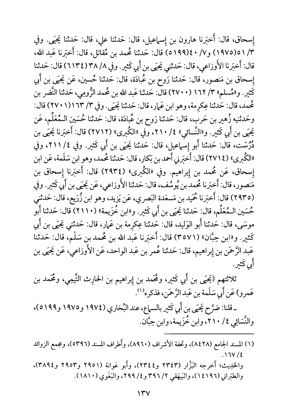 وفي ٣/ ١٦٣ (٢٧٠١) قال: وحدثنيه زهير بن حرب، قال: حدثنا روح بن عبادة، قال: حدثنا حسين المُعَلِّم، عن يحيى بن أبي كثير. و «النَّسَائي» ٤/ ٢١٠، وفي «الكبرى» (٢٧١٢) قال: أخبرنا يحيى بن دُرُست، قال: حدثنا أَبو إسماعيل، قال: حدثنا يحيى بن أبي كثير. وفي ٤/ ٢١١، وفي «الكبرى» (٢٧١٤) قال: أخبرني أحمد بن بكار، قال: حدثنا محمد، وهو ابن سلمة، عن ابن إسحاق، عن محمد بن إبراهيم. وفي «الكبرى» (٢٩٣٤) قال: أخبرنا إسحاق بن منصور، قال: أخبرنا محمد بن يوسف، قال: حدثنا الأوزاعي، عن يحيى بن أبي كثير. وفي (٢٩٣٥) قال: أخبرنا حميد بن مَسعَدة البصري، عن يزيد، وهو ابن زُريع، قال: حدثني حسين المُعَلِّم، قال: حدثنا يحيى بن أبي كثير. و «ابن خزيمة» (٢١١٠) قال: حدثنا أَبو موسى، قال: حدثنا أَبو الوليد، قال: حدثنا عكرمة بن عمار، قال: حدثني يحيى بن أبي كثير. و «ابن حِبَّان» (٣٥٧١) قال: أخبرنا عبد الله بن محمد بن سَلم، قال: حدثنا عبد الرَّحمَن بن إبراهيم، قال: حدثنا عمر بن عبد الواحد، عن الأوزاعي، عن يحيى بن أبي كثير.