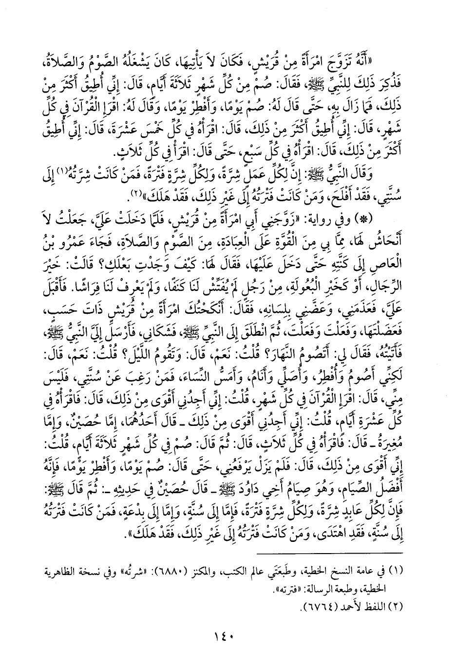 - وفي رواية: «زوجني أبي امرأة من قريش، فلما دخلت علي، جعلت لا أنحاش لها، مما بي من القوة على العبادة، من الصوم والصلاة، فجاء عَمرو بن العاص إلى كنته حتى دخل عليها، فقال لها: كيف وجدت بعلك؟ قالت: خير الرجال، أو كخير البعولة، من رجل لم يفتش لنا كنفا، ولم يعرف لنا فراشا. فأقبل علي، فعذمني، وعضني بلسانه، فقال: أنكحتك امرأة من قريش ذات حسب، فعضلتها، وفعلت وفعلت، ثم انطلق إلى النبي صَلى الله عَليه وسَلم فشكاني، فأرسل إلي النبي صَلى الله عَليه وسَلم فأتيته، فقال لي: أتصوم النهار؟ قلت: نعم، قال: وتقوم الليل؟ قلت: نعم، قال: لكني أصوم وأفطر، وأصلي وأنام، وأمس النساء، فمن رغب عن سنتي، فليس مني، قال: اقرإ القرآن في كل شهر، قلت: إني أجدني أقوى من ذلك، قال: فاقرأه في كل عشرة أيام، قلت: إني أجدني أقوى من ذلك ـ قال أحدهما، إما حصين، وإما مغيرة ـ قال: فاقرأه في كل ثلاث، قال: ثم قال: صم في كل شهر ثلاثة أيام، قلت: إني أقوى من ذلك، قال: فلم يزل يرفعني، حتى قال: صم يوما، وأفطر يوما، فإنه أفضل الصيام، وهو صيام أخي داود صَلى الله عَليه وسَلم ـ قال حصين في حديثه ـ: ثم قال صَلى الله عَليه وسَلم: فإن لكل عابد شرة، ولكل شرة فترة، فإما إلى سنة، وإما إلى بدعة، فمن كانت فترته إلى سنة، فقد اهتدى، ومن كانت فترته إلى غير ذلك، فقد هلك».