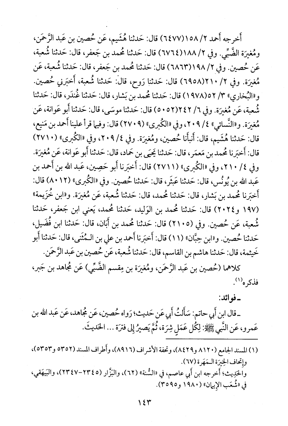 أخرجه أحمد (٦٤٧٧) قال: حدثنا هُشيم، عن حصين بن عبد الرَّحمَن، ومغيرة الضبي. وفي ٢/ ١٨٨ (٦٧٦٤) قال: حدثنا محمد بن جعفر، قال: حدثنا شعبة، عن حصين. وفي ٢/ ١٩٨ (٦٨٦٣) قال: حدثنا محمد بن جعفر، قال: حدثنا شعبة، عن مغيرة. وفي ٢/ ٢١٠ (٦٩٥٨) قال: حدثنا روح، قال: حدثنا شعبة، قال: أخبرني حصين. و «البخاري» ٣/ ٤٠ (١٩٧٨) قال: حدثنا محمد بن بشار، قال: حدثنا غُندَر، قال: حدثنا شعبة, عن مغيرة. وفي ٦/ ١٩٦ (٥٠٥٢) قال: حدثنا موسى، قال: حدثنا أَبو عَوانة، عن مغيرة. و «النَّسَائي» ٤/ ٢٠٩، وفي «الكبرى» (٢٧٠٩) قال: وفيما قرأ علينا أحمد بن مَنيع، قال: حدثنا هُشيم، قال: أنبأنا حصين، ومغيرة. وفي ٤/ ٢٠٩، وفي «الكبرى» (٢٧١٠) قال: أخبرنا محمد بن معمر، قال: حدثنا يحيى بن حماد، قال: حدثنا أَبو عَوانة، عن مغيرة. وفي ٤/ ٢١٠، وفي «الكبرى» (٢٧١١) قال: أخبرنا أَبو حصين عبد الله بن أحمد بن عبد الله بن يونس، قال: حدثنا عبثر، قال: حدثنا حصين. وفي «الكبرى» (٨٠١٢) قال: أخبرنا محمد بن بشار، قال: حدثنا محمد، قال: حدثنا شعبة، عن مغيرة. و «ابن خزيمة» (١٩٧ و ٢٠٢٤) قال: حدثنا محمد بن الوليد، قال: حدثنا محمد، يعني ابن جعفر، قال: حدثنا شعبة، عن حصين. وفي (٢١٠٥) قال: حدثنا محمد بن أبان، قال: حدثنا ابن فضيل، قال: حدثنا حصين. و «ابن حِبَّان» (١١) قال: أخبرنا أحمد بن علي بن المثنى، قال: حدثنا أَبو خيثمة، قال: حدثنا هاشم بن القاسم، قال: حدثنا شعبة، عن حصين بن عبد الرَّحمَن.