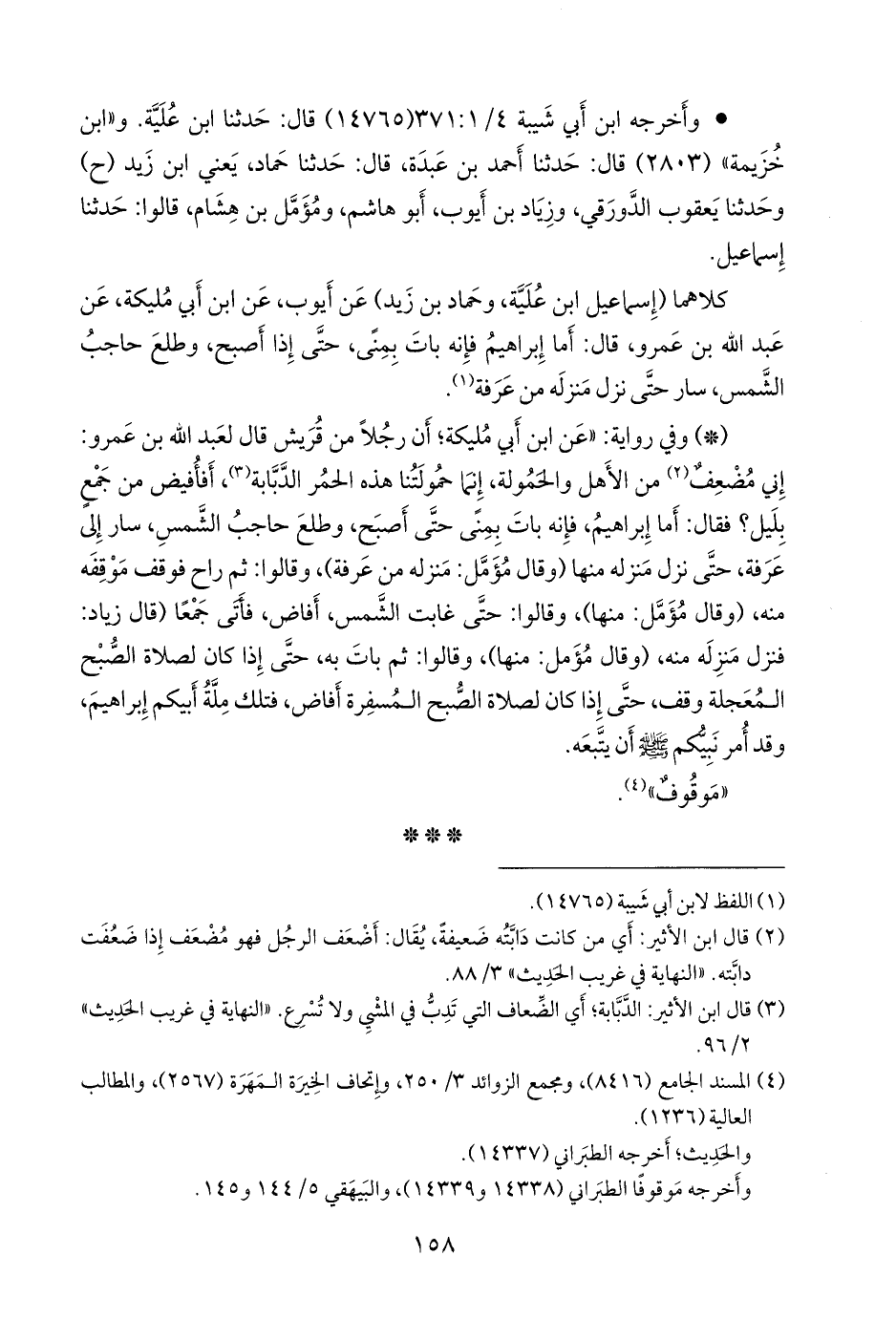 كلاهما (إسماعيل ابن عُلَية، وحماد بن زيد) عن أيوب، عن ابن أَبي مُليكة، عن عبد الله بن عَمرو، قال: أما إبراهيم فإنه بات بمنى، حتى إذا أصبح، وطلع حاجب الشمس، سار حتى نزل منزله من عرفة (¬١).