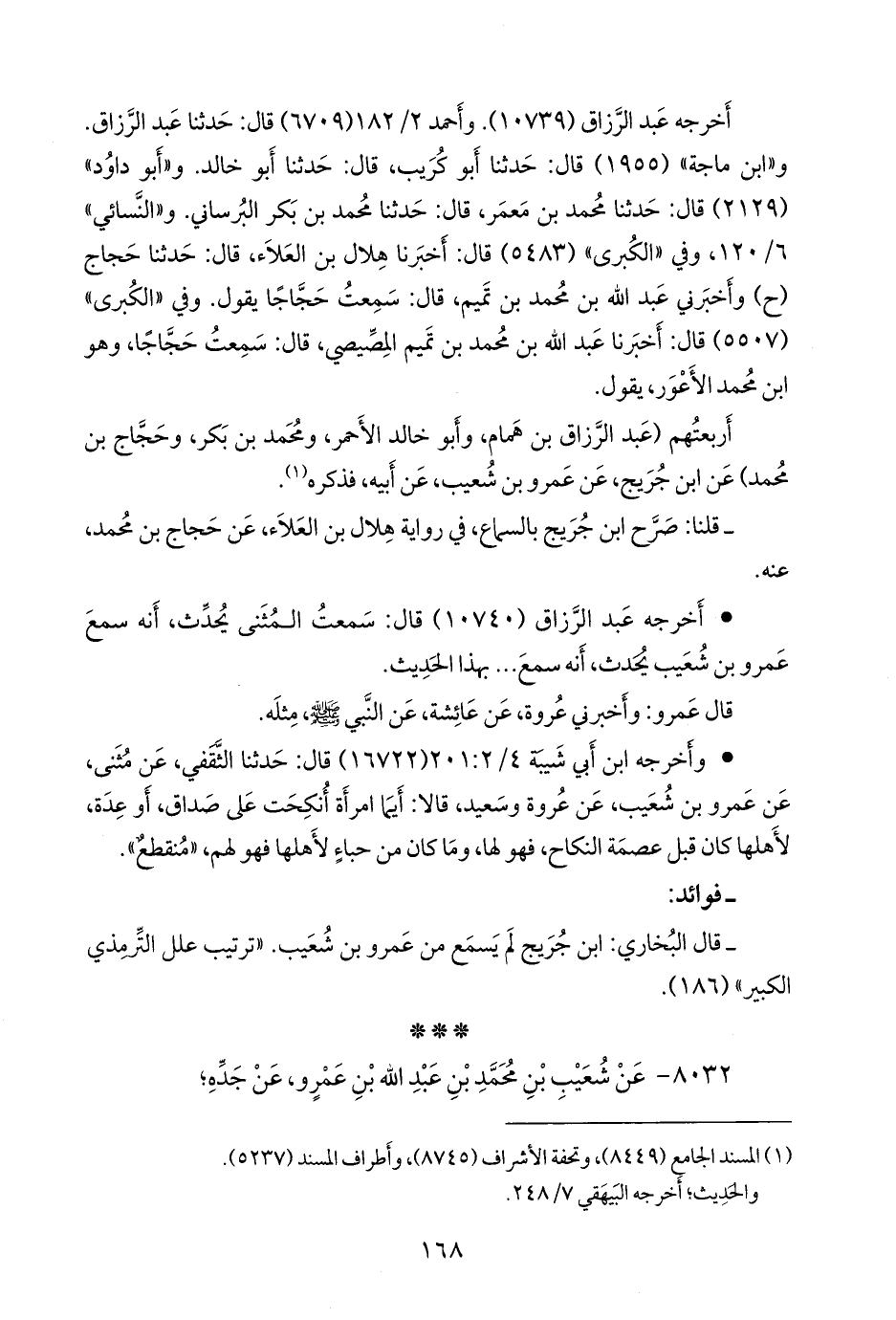 أربعتهم (عبد الرزاق بن همام، وأَبو خالد الأحمر، ومحمد بن بكر، وحجاج بن محمد) عن عبد الملك بن جُريج، عن عَمرو بن شعيب، عن أبيه، فذكره (¬١).