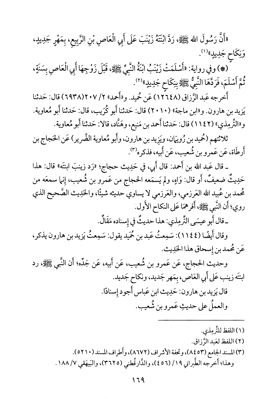 - قال عبد الله بن أحمد: قال أبي، في حديث حجاج؛ «رد زينب ابنته» قال: هذا حديثٌ ضعيف، أو قال: واه، ولم يسمعه الحجاج من عَمرو بن شعيب، إنما سمعه من محمد بن عُبيد الله العَرزَمي، والعَرزَمي لا يساوي حديثه شيئا، والحديث الصحيح الذي روي؛ أن النبي صَلى الله عَليه وسَلم أقرهما على النكاح الأول.