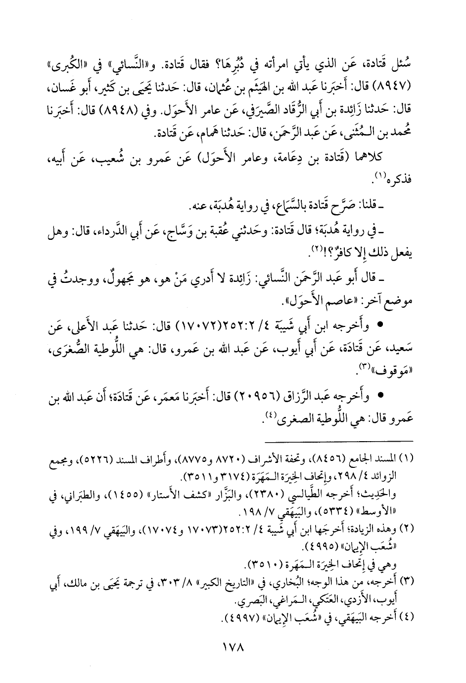 - وأَخرجه عبد الرزاق (٢٠٩٥٦) قال: أَخبرنا مَعمَر، عن قتادة؛ أَن عبد الله بن عَمرو قال: هي اللوطية الصغرى (¬٢).