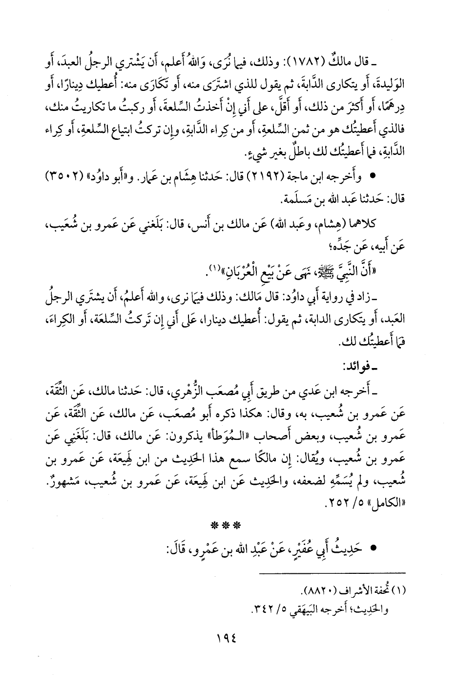 - قال القاضي عِياض: وفي باب بيع العُربان: مالك، عن الثقة، عن عَمرو بن شعيب، كذا عند جميع شيوخنا عن يحيى، وتابعه ابن عبد الحكم وبعض رواة «الموطأ».