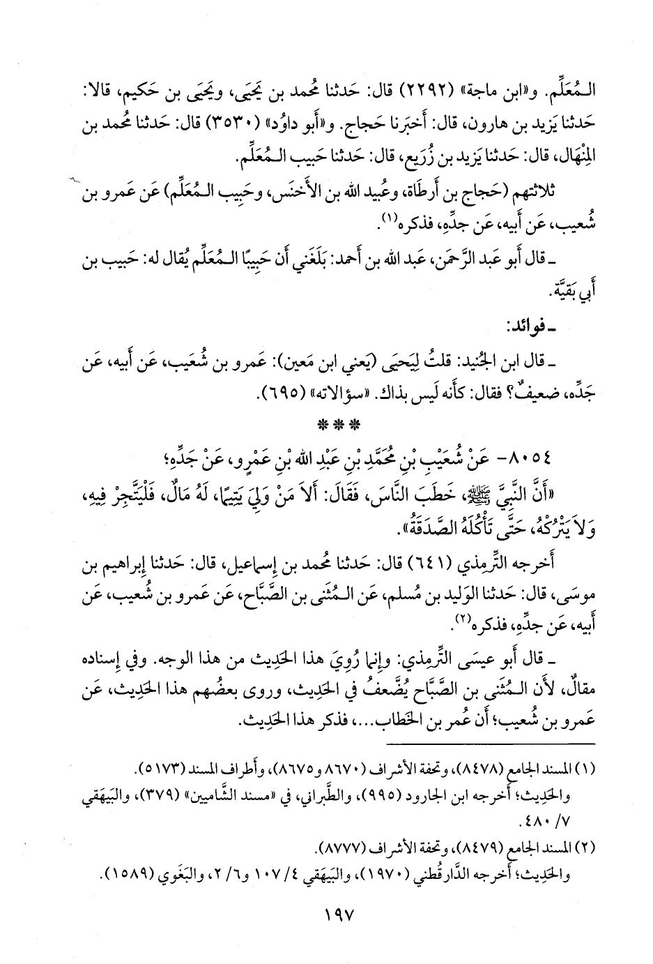 وعَمرو بن شعيب، هو ابن محمد بن عبد الله بن عَمرو بن العاص، وشعيب قد سمع من جده عبد الله بن عَمرو، وقد تكلم يحيى بن سعيد في حديث عَمرو بن شعيب، وقال: هو عندنا واه، ومن ضعفه من قبل أنه يحدث من صحيفة جده عبد الله بن عَمرو، وأما أكثر أهل الحديث، فيحتجون بحديث عَمرو بن شعيب، فيثبتونه، منهم أحمد، وإسحاق، وغيرهما.