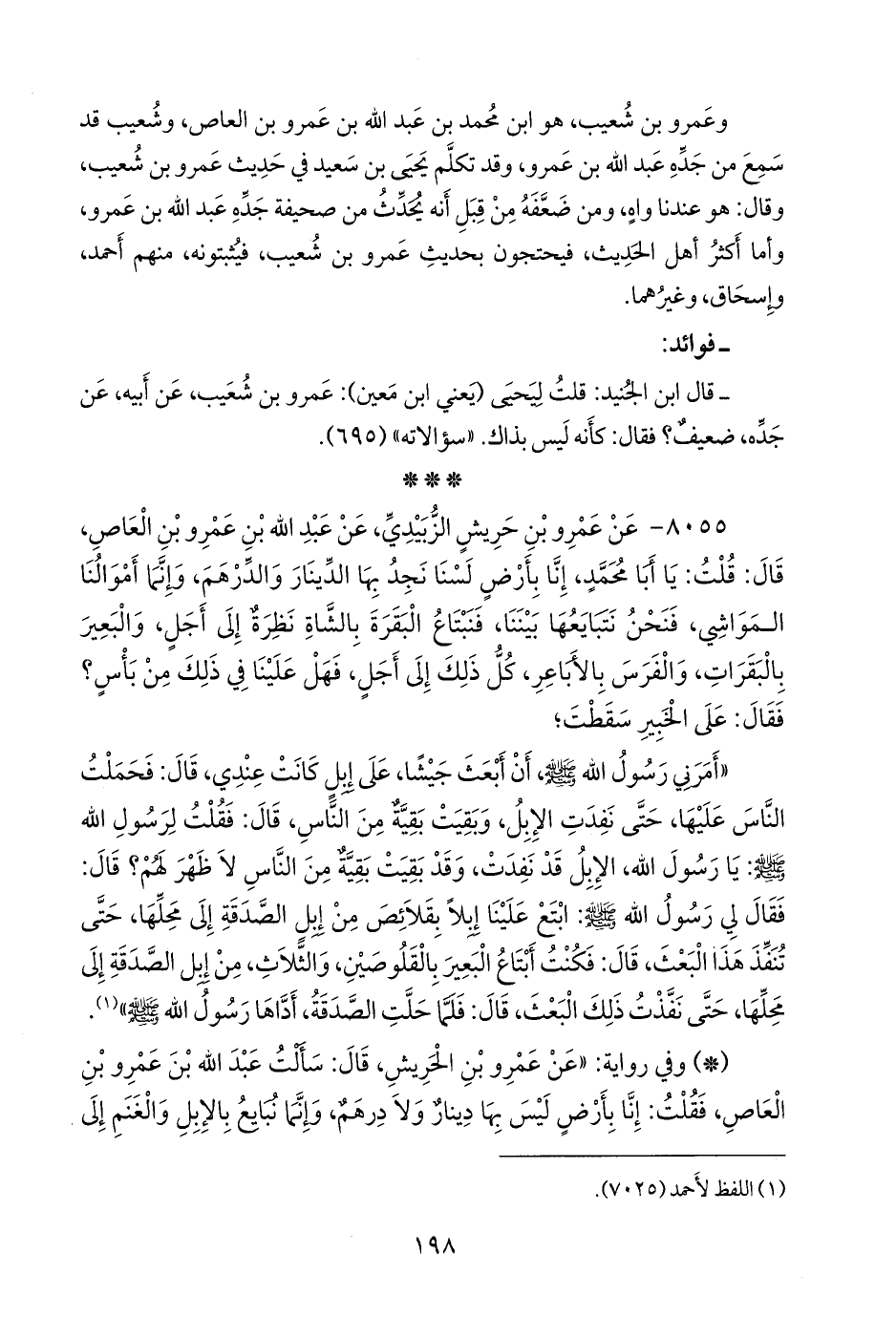 - وفي رواية: «عن عَمرو بن الحريش، قال: سألت عبد الله بن عَمرو بن العاص، فقلت: إنا بأرض ليس بها دينار ولا درهم، وإنما نبايع بالإبل والغنم إلى
