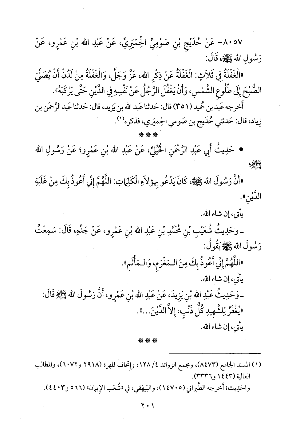 (¬١) المسند الجامع (٨٤٧٣)، ومَجمَع الزوائد ٤/ ١٢٨، وإتحاف الخِيرَة المَهَرة (٢٩١٨ و ٦٠٧٢)، والمطالب العالية (١٤٤٣ و ٣٣٣٦).