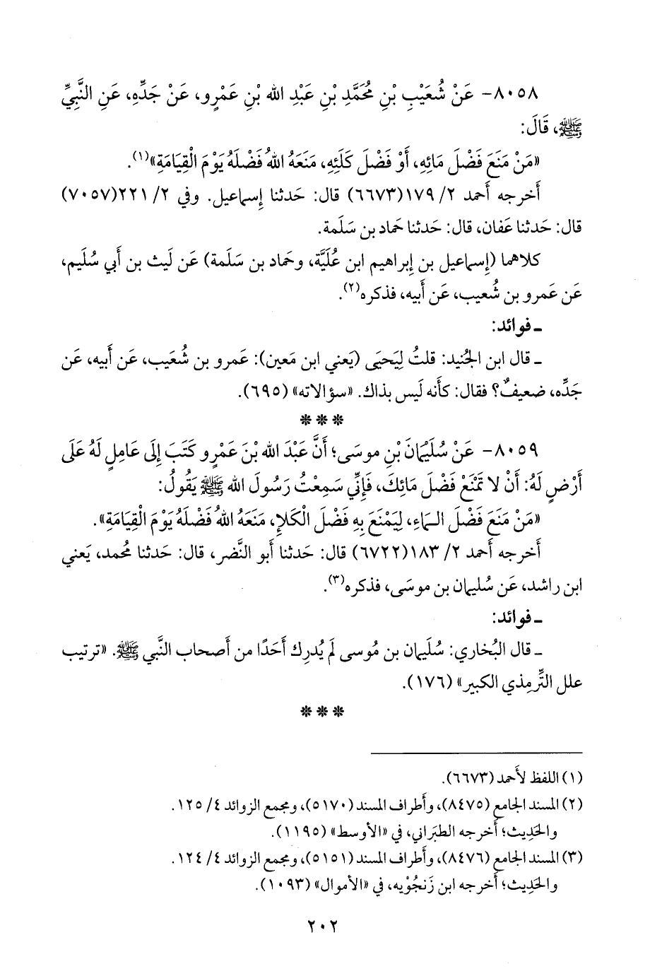٨٠٥٩ - عن سليمان بن موسى؛ أن عبد الله بن عَمرو كتب إلى عامل له على أرض له: أن لا تمنع فضل مائك، فإني سمعت رسول الله صَلى الله عَليه وسَلم يقول: